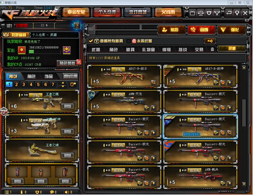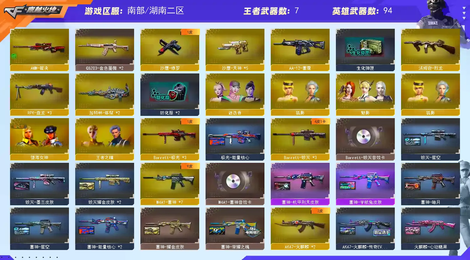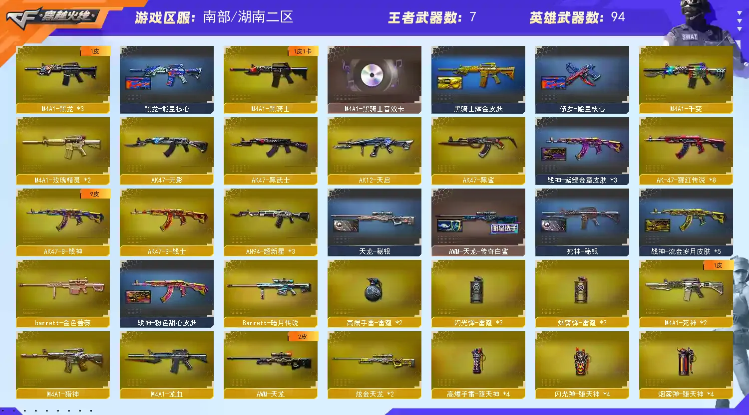 【主 武】:王者之幻(已觉醒)、王者之力、王者之魄、王者之势(已觉醒)、王者之武、王者之影、炫金火麒麟、炫金天龙X2、炫金雷神、炫金骑士、炫金超新星、武圣青龙、千变、火麒麟(传奇EVEN皮肤、CFSTAR、雷神、AG战队皮肤)、黑龙X3(暗月)、雷神X7(雷神音效卡、耀金皮肤、荣耀皮肤、星空、暗月、能量核心皮肤)、黑骑士(音效卡、耀金)、无影、死神X2(秘银)、黑武士、天启、超新星X3、黑鲨、龙血、玫瑰精灵X2、QBZ03金色蔷薇X2、猎神、烈火X2、AK47-猩红传说X7(老兵传说皮肤)、AK47-B-战士、AK47-B-战神(粉色甜心皮肤、流金岁月皮肤、紫媛金章皮肤)、天龙(传奇白鲨、秘银皮肤)、毁灭X3(毁灭音效卡、AGCFPLS15冠军皮肤、耀金皮肤、星空皮肤)、极光X3(能量核心)、裁决、Barrett金色蔷薇、Barrett暗月传说、加特林炼狱X2、盘龙X3、烈龙、AA12雷霆、源雷神、源天启、、天蝎座、金牛座、白羊座、射手座、神罚、乱世、苍雷、斯泰尔恶棍、征服者、死亡之眼、激光毁灭者3级、巴雷特零水下丽影、