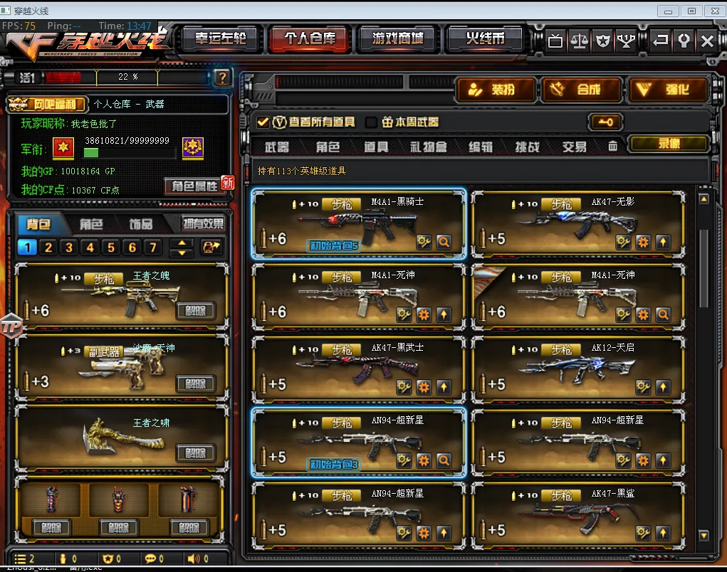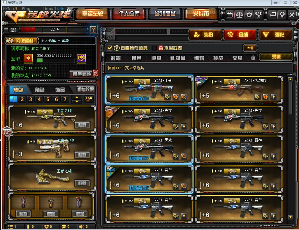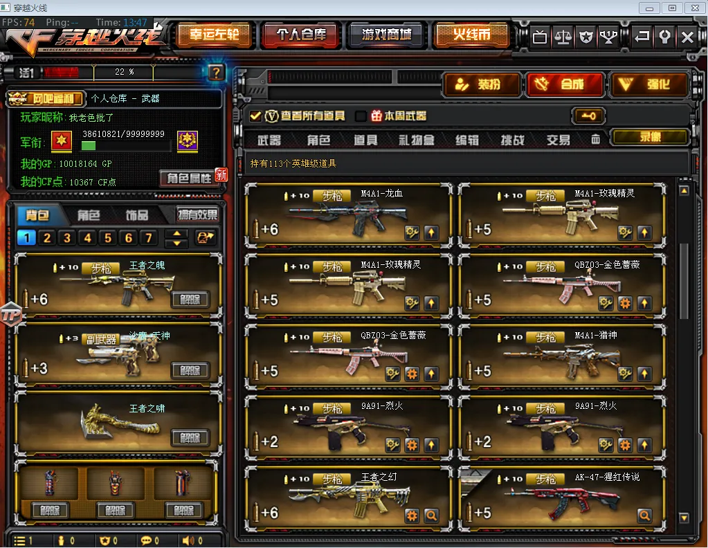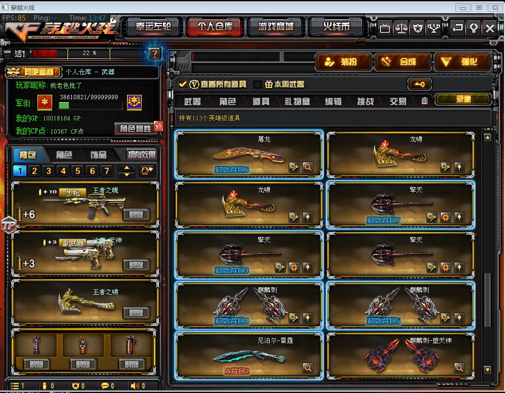 【主 武】:王者之幻(已觉醒)、王者之力、王者之魄、王者之势(已觉醒)、王者之武、王者之影、炫金火麒麟、炫金天龙X2、炫金雷神、炫金骑士、炫金超新星、武圣青龙、千变、火麒麟(传奇EVEN皮肤、CFSTAR、雷神、AG战队皮肤)、黑龙X3(暗月)、雷神X7(雷神音效卡、耀金皮肤、荣耀皮肤、星空、暗月、能量核心皮肤)、黑骑士(音效卡、耀金)、无影、死神X2(秘银)、黑武士、天启、超新星X3、黑鲨、龙血、玫瑰精灵X2、QBZ03金色蔷薇X2、猎神、烈火X2、AK47-猩红传说X7(老兵传说皮肤)、AK47-B-战士、AK47-B-战神(粉色甜心皮肤、流金岁月皮肤、紫媛金章皮肤)、天龙(传奇白鲨、秘银皮肤)、毁灭X3(毁灭音效卡、AGCFPLS15冠军皮肤、耀金皮肤、星空皮肤)、极光X3(能量核心)、裁决、Barrett金色蔷薇、Barrett暗月传说、加特林炼狱X2、盘龙X3、烈龙、AA12雷霆、源雷神、源天启、、天蝎座、金牛座、白羊座、射手座、神罚、乱世、苍雷、斯泰尔恶棍、征服者、死亡之眼、激光毁灭者3级、巴雷特零水下丽影、