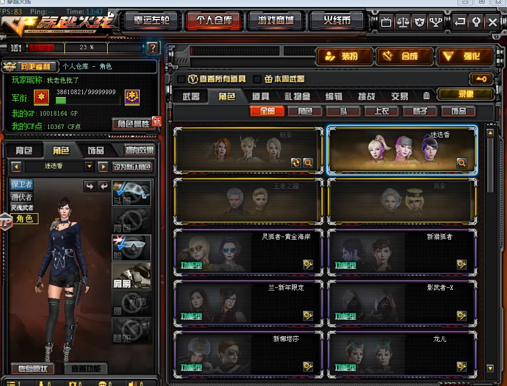 【角 色】:CFVIP5、元首等级、王者之瞳、迷迭香、孤影、魅影、灵狐者黄金海岸、新猎狐者、兰新年限定、影武者X、复仇者、幻影、邓紫棋、救世复仇、海军陆战队、娜塔莎、王力宏、深海之兰、飞狐、夜玫瑰、烟雾保护头盔、闪光护目镜、超级背包、炫彩背包、双蛇戒指、8周年戒指
