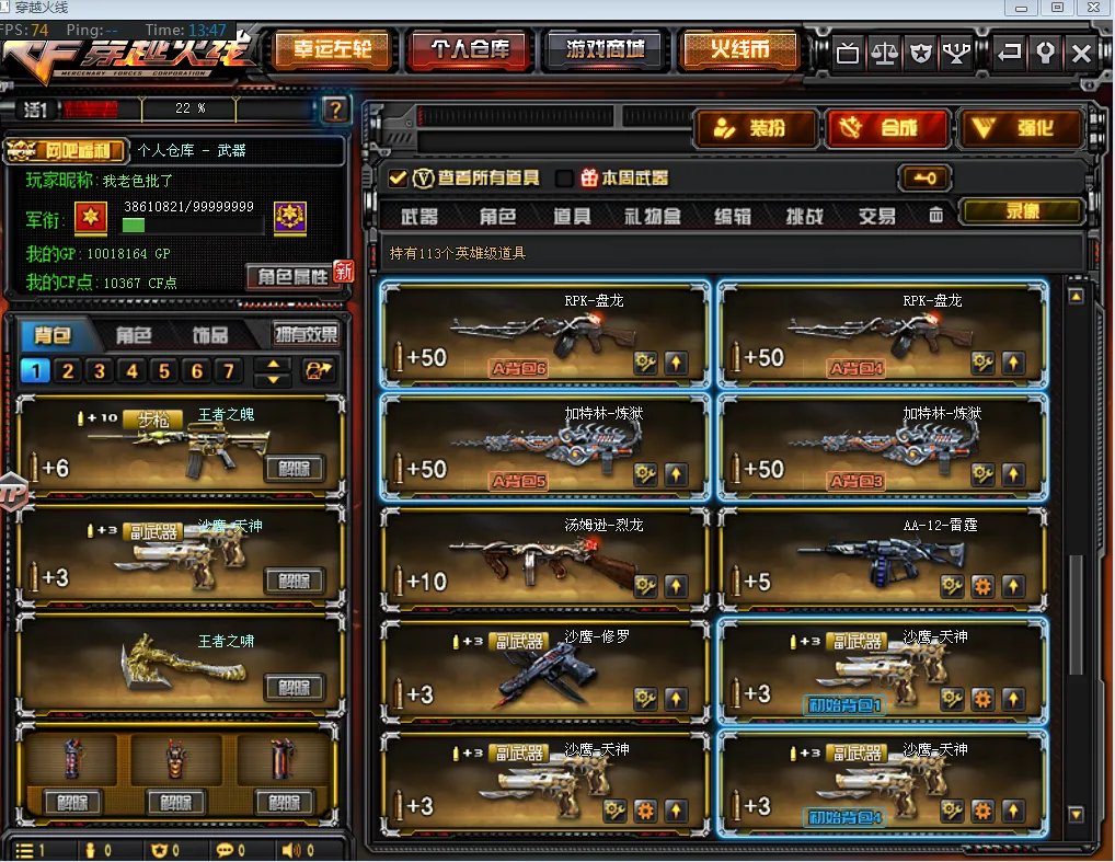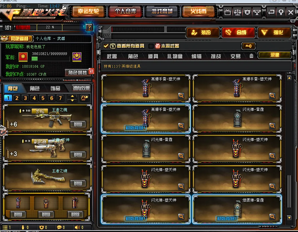 【道具】:毁灭音效卡、雷神音效卡、黑骑士音效卡、幸运鼠玩偶X2、铁骑玩偶、关羽玩偶、审判者玩偶X2、暴躁猪猪玩偶、小红玩偶、审判者玩偶X2、斯沃特玩偶、14个背包、AC(防弹头盔-防弹衣)、C4工具钳、手雷包、夺命之镰、变异宝贝、迷雾幽灵、疯狂宝贝、生化弹夹、防化服、冲锋枪弹夹、步枪弹夹、极限战斗背包
