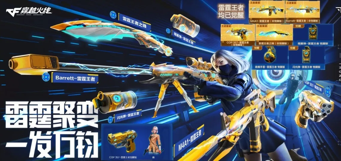 雷霆王者全套(雷霆王者M4-觉醒+光效;雷霆王者-巴雷特-觉醒+光效;雷霆王者-cop-光效;雷霆王者之锋-光效;雷霆王者-高爆;雷霆王者-闪光;雷霆王者-烟雾)、
