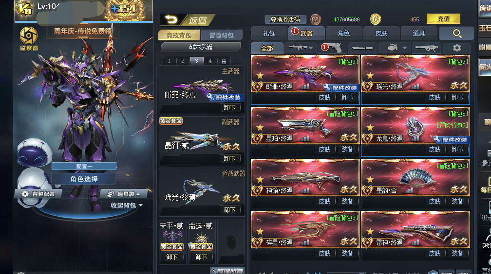 ✨传说武器齐全一共有二十七把分别是星珀终焉,RPK主宰,龙息终焉,神谕终焉,AK47主宰,墨韵合,碎星终焉,雷神终焉,黄金国影魔(未央皮肤 有角色影魔),M4A1无限EX(金蛇,紫水晶皮肤),六把无尽光影终焉(有最新皮肤深海之渊和次元战争皮肤),屠魔,万化无限爆裂,PRK天神,AK-47天神,