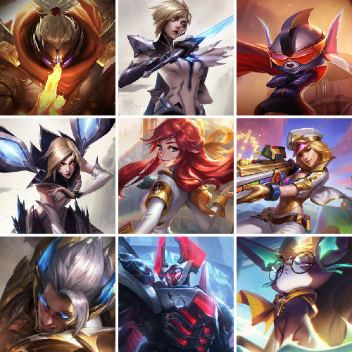 至臻锐雯、至臻德玛、海克斯小炮、海克斯梦魇、海克斯鳄鱼、狗年狼人、龙刀、西部天使艾希、新至臻卡莎、至臻瑟提、至臻拉克丝、至臻盖伦、海克斯崔丝塔娜、狗年狼人、蛇年火女、龙刀、西部寒冰、大魔王提莫、生化领主蛮王、星之守护霞、星守霞、冠军掠夺者、源计划派克、源计划寒冰、源计划VN、源计划烬、御星魔矢、弹幕天使卡莎、电玩卡莎、糖果使徒、卧虎藏龙、电玩飞机、腥红之月派克、腥红之月卡特、腥红之月蛮王、冠军之矛、情人寒冰、觅心女王、IG卡莎、IG卡蜜尔、IG剑姬、地底世界、神拳、武神、圣诞老人布隆、魄罗骑士、勇者阿狸、勇者豹女、玉剑传说风女、未来战士卡牌、未来战士女警、未来战士锐雯、未来战士慎、霸天零式、万圣节豹女、FNATIC皇子、源计划刀妹、源计划阿卡丽、吕布、赵云、黑帮管家、永恒星碑(记录kda)全英雄