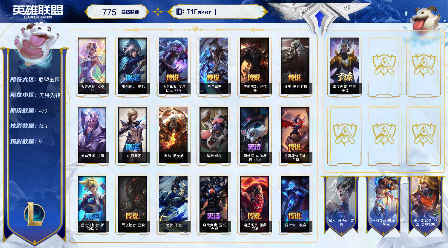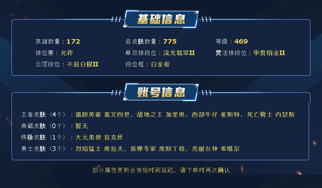 【全英雄可排位393原皮肤69炫彩皮肤】海克斯玛尔扎哈、黎明使者卡尔玛、暗星大虫子、神龙尊者瞎子、星守芮尔、星守岩雀、真实伤害全套、玉剑传说男刀、星之守护者EZ、马年皎月、猴年猴子、狗年狼人、蛇年安妮、神龙尊者夜月幻龙亚索、神龙尊者昼日真龙亚索、星之守护者芮尔、星之守护者岩雀、光明哨兵奥拉夫、永恒之森奥恩、泳池派对布隆、2021全球总决赛皇子、EDG佐伊、DWG凯南、断浪之刃亚索、咖啡甜心格温、福牛守护者佛耶戈、狮子星神豹女、神龙尊者瑟提、灵魂莲华蛇女、灵魂莲华莉莉娅、灵魂莲华亚索、灵魂莲华永恩、灵能特工莎弥拉、大元素使、地底世界、魅惑女巫女枪、觅心猫猫悠米、MSI妖姬、制胜金靴、暗星锤石、奥德赛凯隐、黑夜亚索、黎明奶妈、神拳李青、神王诺手、未来战士女警、西部魔影卢锡安、源计划薇恩、源计划寒冰、真实伤害艾克、奥术师佐伊、奥术师大嘴、地狱火阿木木、柯基库奇、魔女卡蜜尔、千纸凤凰、武神、西部魔影人马、小蜜蜂提莫、腥红之月剑魔、玉剑传说莫甘娜、玉剑传说锐雯、源计划蔚、源计划狼人、源计划刀妹、源计划烬、战斗学院杰斯、战斗学院卡特、赵云、真实伤害亚索、真实伤害赛娜、真实伤害奇亚娜、真实伤害阿卡丽