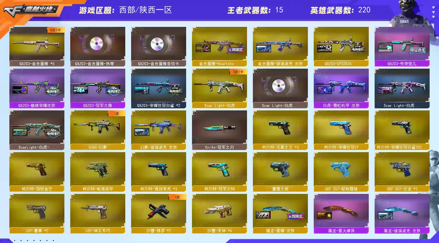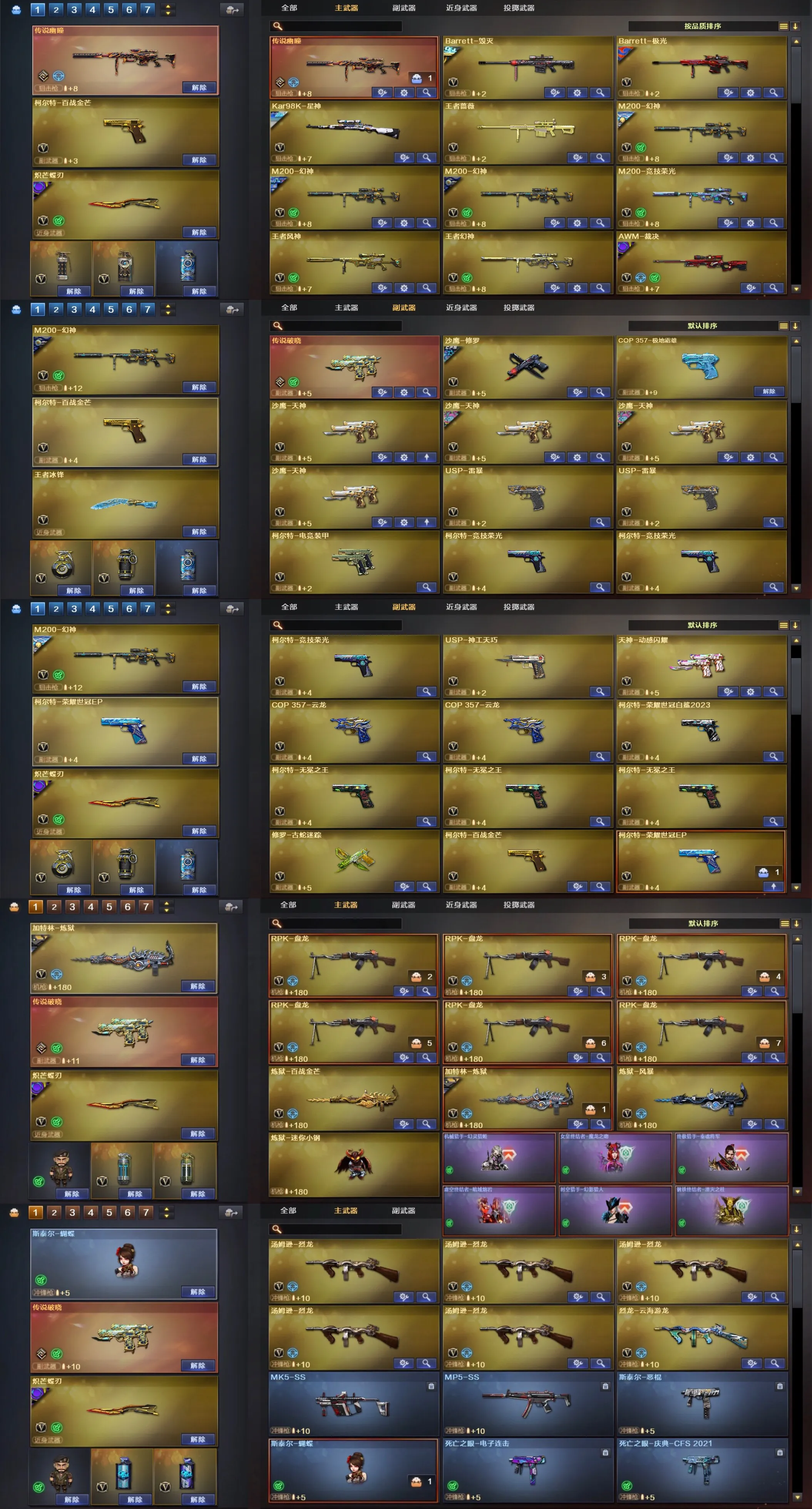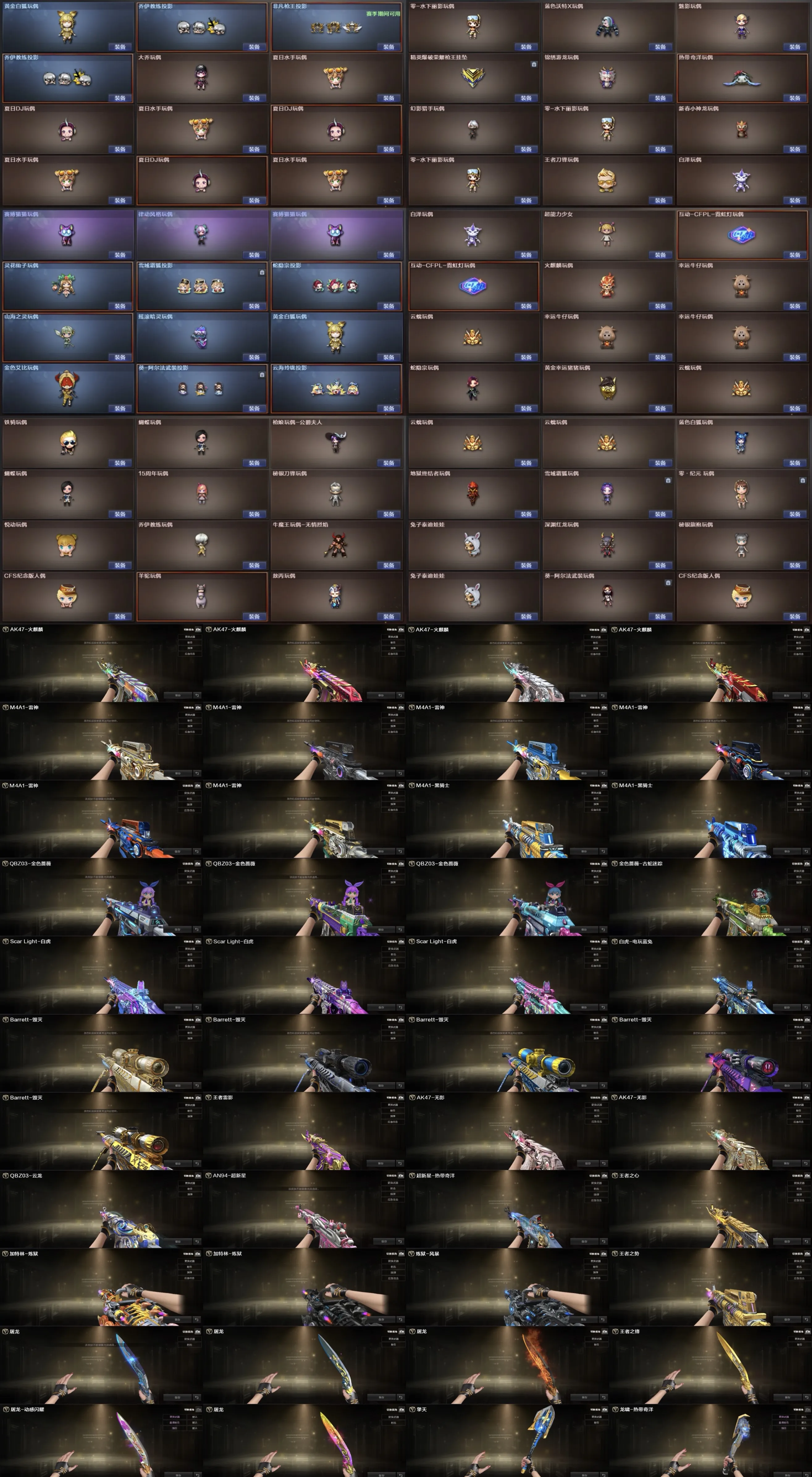 M200-幻神(3)/Kar98k-量子之心/M200-竞技荣光/王者幻神-觉醒版/Barrett-毁灭(2)/Barrett-极光/barrett-金色蔷薇/Barrett-暗月传说(2)/王者蔷薇-觉醒版/Kar98K-星神/AWM-裁决/M4A1-雷神(4)/M4A1-死神/M4A1-黑龙/M4A1-黑骑士(3)/黑骑士-海王(2)/王者之势-觉醒版(2)/王者之圣-觉醒版/王者之幻-觉醒版/HK417-朱雀/_Scar Light-白虎/白虎-电玩蓝兔/AK12-天启/AK47-火麒麟(2)/AK47-无影(2)/无影-神兵利器/AK-47-猩红传说(2)/AK47-机械迷城/AK47-B-身先士卒/AK47-B-常胜将军(2)/AK47-B-战士/AK47-B-战神/AN94-超新星/QBZ03-云龙/QBZ03-金色蔷薇(5)/王者之心-觉醒版/王者之城-觉醒版/烈火-动感闪耀/9A91-烈火/RPK-盘龙(6)/汤姆逊-烈龙(5)/AA-12-雷霆/加特林-炼狱/炼狱-风暴/COP 357-云龙(2)/天神-动感闪耀/沙鹰-天神(4)/沙鹰-修罗(2)/柯尔特-电竞装甲/柯尔特-竞技荣光(3)/USP-雷暴(2)/USP-神工天巧/云龙扇/麒麟刺(3)/龙啸/擎天(4)/擎天-竞技荣光(2)/王者之击-觉醒版(2)/屠龙-动感闪耀/屠龙(4)/幻灵之锋(3)/王者之锋-觉醒版/斩神刀-雷暴(3)/唐刀-神工天巧/炽芒蝶刃(2)/手雷-动感闪耀(2)/高爆手雷-云龙/高爆手雷-神工天巧/高爆手雷-雷暴(5)/高爆手雷-竞技荣光(5)/烟雾弹-云龙/烟雾弹-神工天巧/烟雾弹-雷暴(5)/烟雾弹-竞技荣光(5)/烟雾弹-电竞装甲/恶棍-电竞装甲/闪光弹-云龙/闪光弹-神工天巧/闪光弹-雷暴(5)/闪光弹-竞技荣光(5)/闪光弹-电竞装甲/机械迷城-穹宇/死神-雪域霜狐/M4A1-凌龙-I/G36C-幻影/超新星-热带奇洋/黑武士-锦绣游龙/Barrett-碧霄极光/王者风神-觉醒版/烈龙-云海游龙/柯尔特无冕之王(3)/柯尔特-百战金芒/柯尔特-荣耀世冠EP/龙啸-烈火龙威/龙啸-热带奇洋/擎天-热带奇洋/竞技荣光/云龙/雷暴/神工天巧/王者雷影/王者冰锋(2)/火麒麟-零纪元/M4A1-雷神-精英刀锋/HK417-朱雀-蛇隐宗/Scar Light-马枪/M37-葵