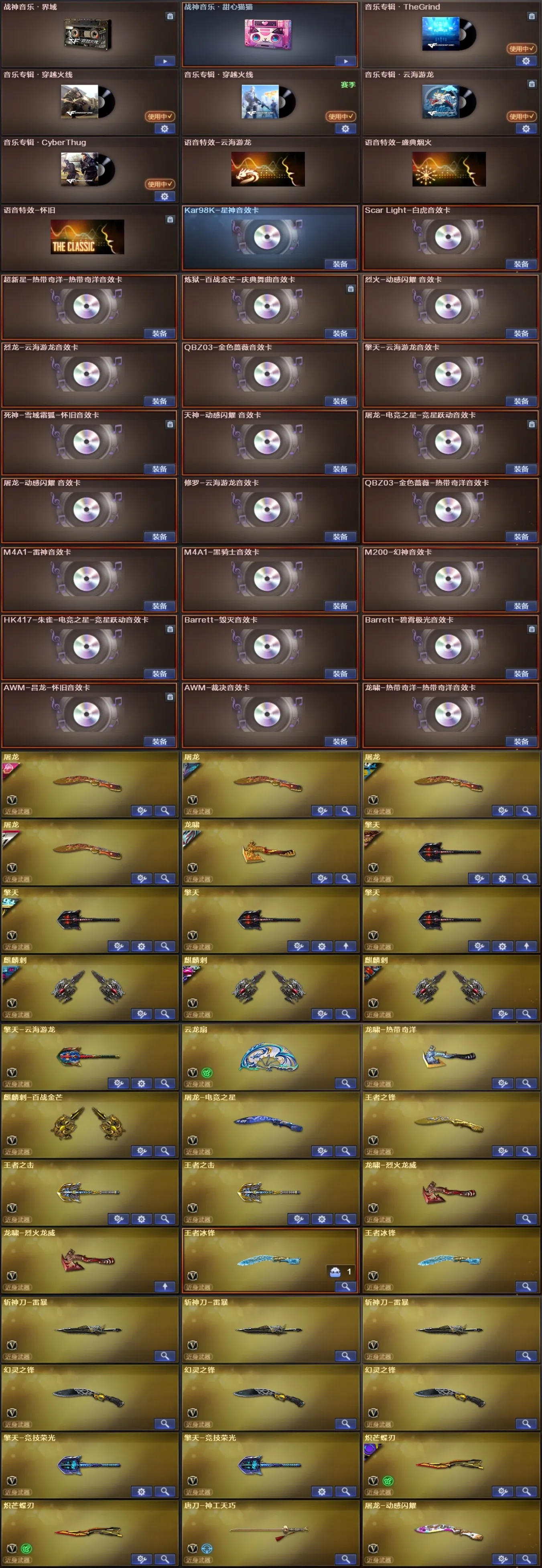 幻神音效卡、星神音效卡、裁决音效卡、QBZ音效卡、毁灭音效卡、白虎音效卡、雷神音效卡、黑骑士音效卡、全音效、动感闪耀音效卡、云海游龙音效卡、热带奇洋音效卡、死神雪域霜狐音效卡、炼狱百战金芒音效卡