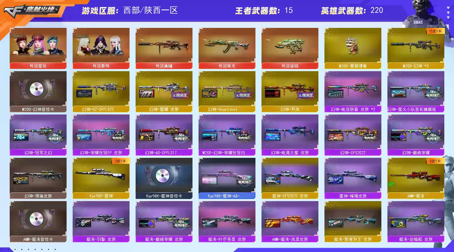传说星骇传说幽瞳/三把幻神15皮肤 KZ-CFPLS25冠军荣耀世冠EP 电竞之星冠军之幻 Heartshot女团星火小队星耀AG-CFPLS17冠军 巅峰荣耀世冠白鲨CFS2022 丹凤周瑜电流骇客幻神动物皮喜狮赋予/冠军之薇冠军之特冠军之刃/王者风神王者幻神竞技荣光/传说影煞传说破晓传说辉光/柯尔特荣耀世冠EP百战金芒世冠白鲨2023无冕之王 USP雷暴神工天巧 COP雷霆COP云龙/G36C幻影破浪逐光三件套/隼鹰智晴雅雨墨云悠悠影豹 王者晴雅王者魅影职业经理 空零热舞青春兰梨园特工兰春雅灵花/满配主流副武器 22张音效卡158个枪刀皮/双王者冰锋 六盘六烈蝴蝶 炽芒蝶刃巅峰荣耀 炼狱8皮肤 猎手+终结者7皮肤/顶配生化 双模式全装 裁决卡 幻神卡 星神卡白虎卡QBZ卡毁灭卡雷神卡黑骑士卡等