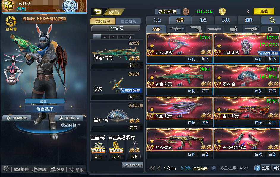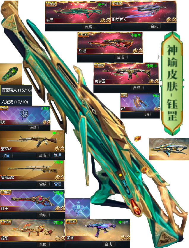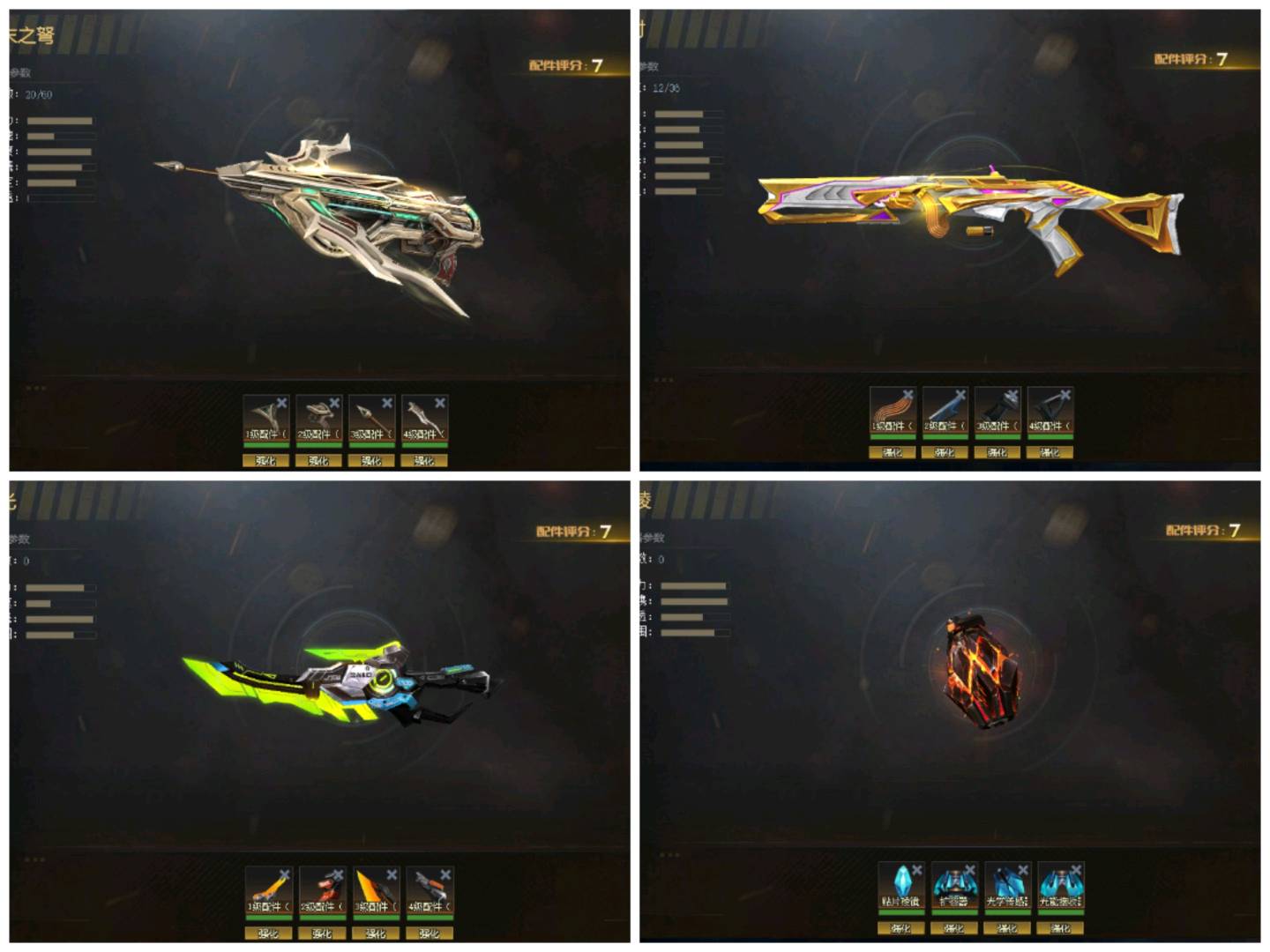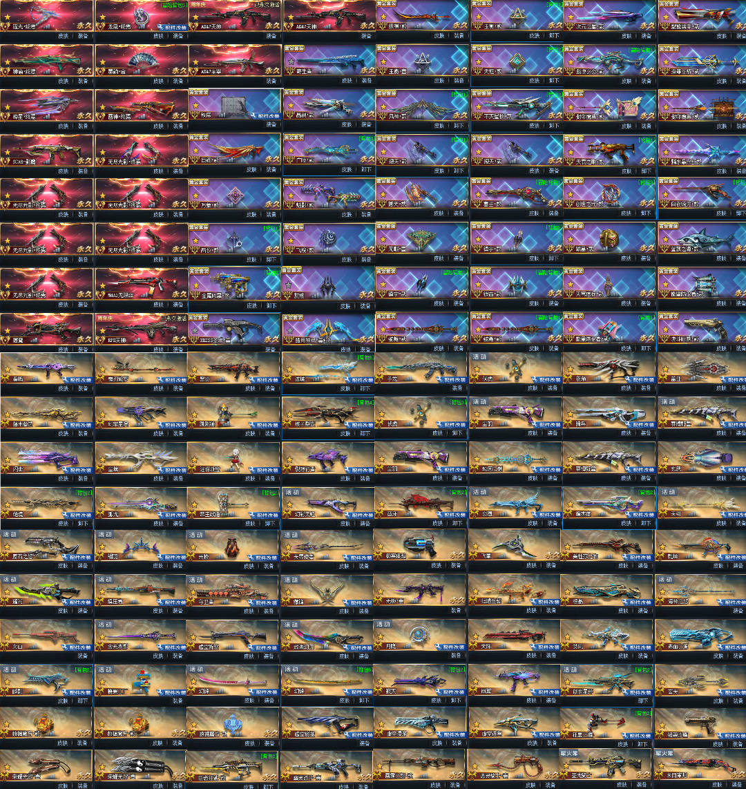 传说武器:龙息终焉⭐神谕终焉⭐墨韵合⭐碎星终焉⭐雷神终焉⭐SCAR影魔⭐M4A1无限EX⭐屠魔⭐无尽光影x6⭐RPK天神⭐AK47天神x2⭐AK47主宰