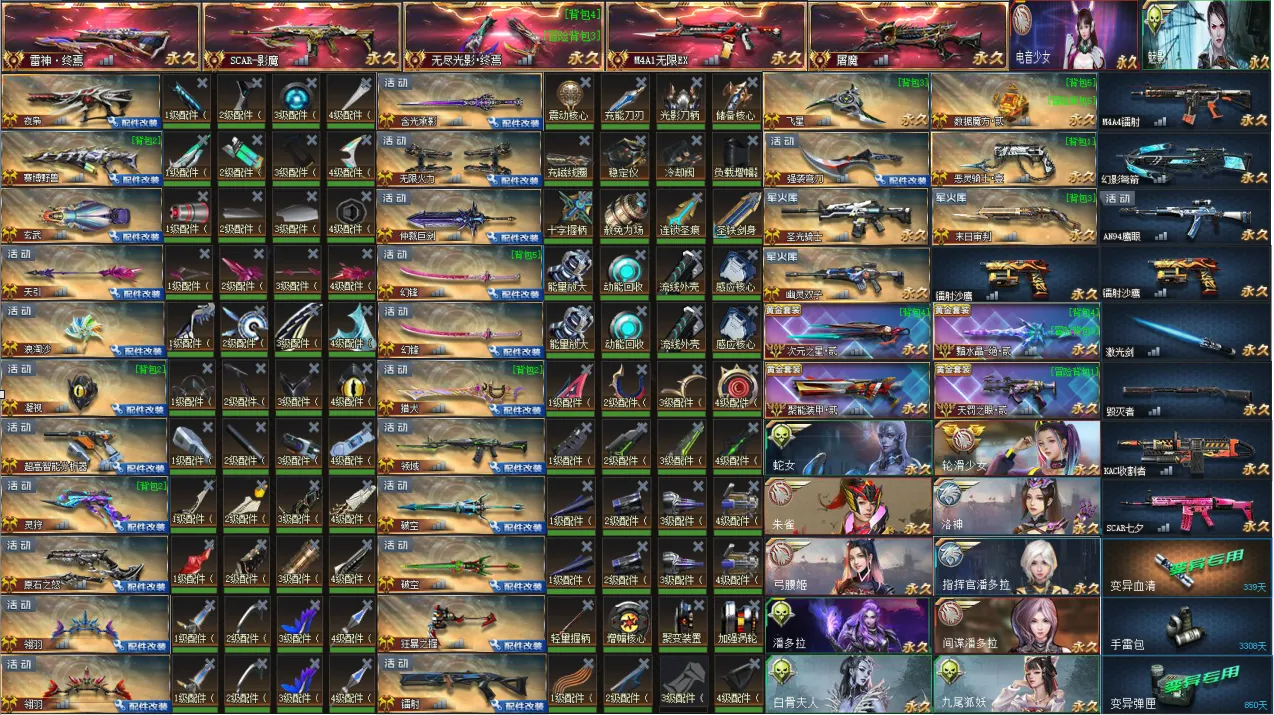 【配件武器】[满配夜枭][满配赛博野兽][满配玄武][满配天引][满配浪淘沙-灵鸢之赐][满配凝视][满配超高智能分析器][满配灵狩-灵魂奥秘][满配原石-云墨][满配翎羽-银河][满配翎羽-暮色][满配含光承影-断罪][满配无限火力][满配仲裁巨剑-魔界守门人][满配幻锋-樱之舞][满配幻锋-樱之舞][满配猎犬-紫藤][满配领域][满配破空-星舰][满配破空-圣诞快乐][满配狂暴之握][三配镭射]
