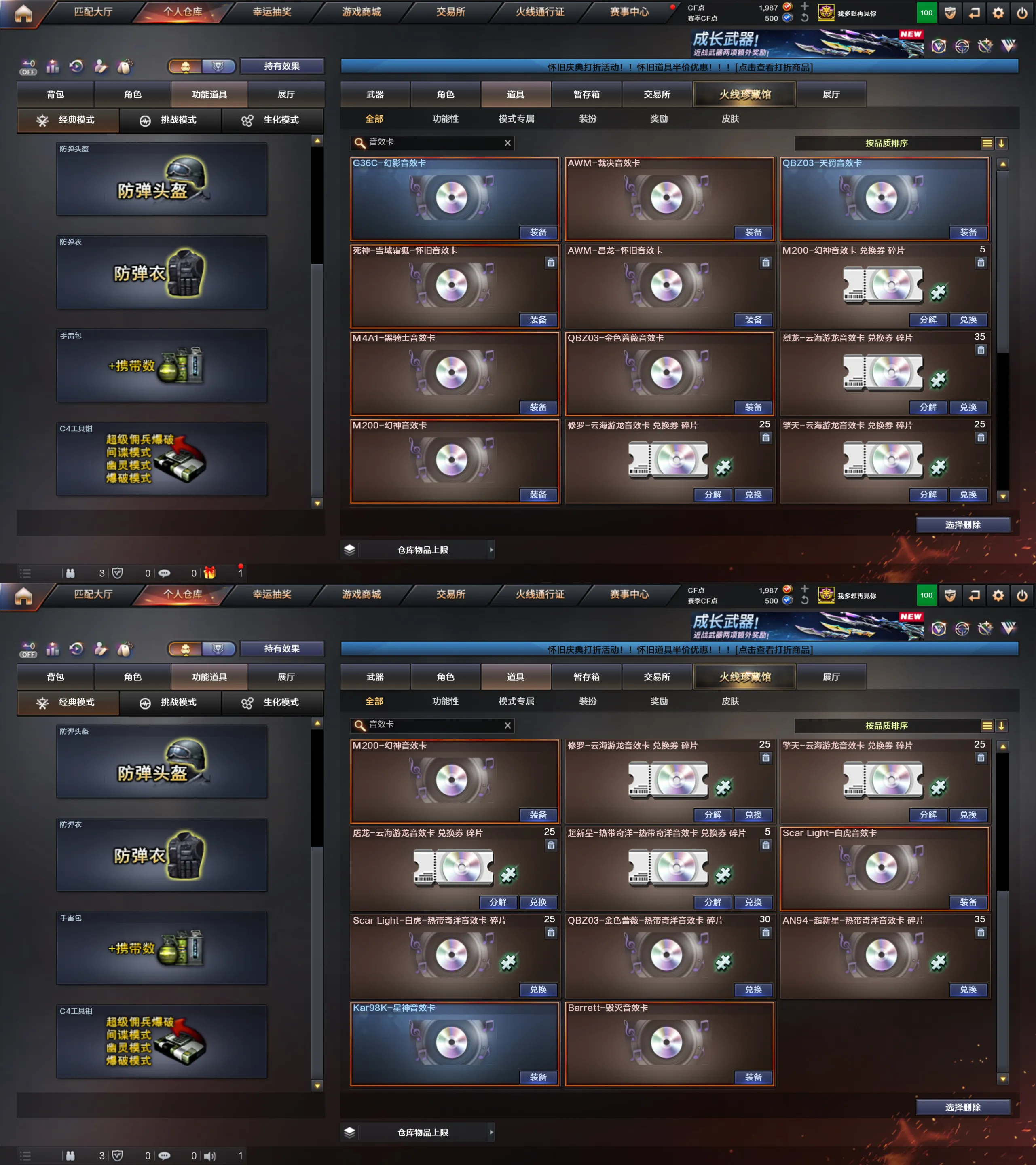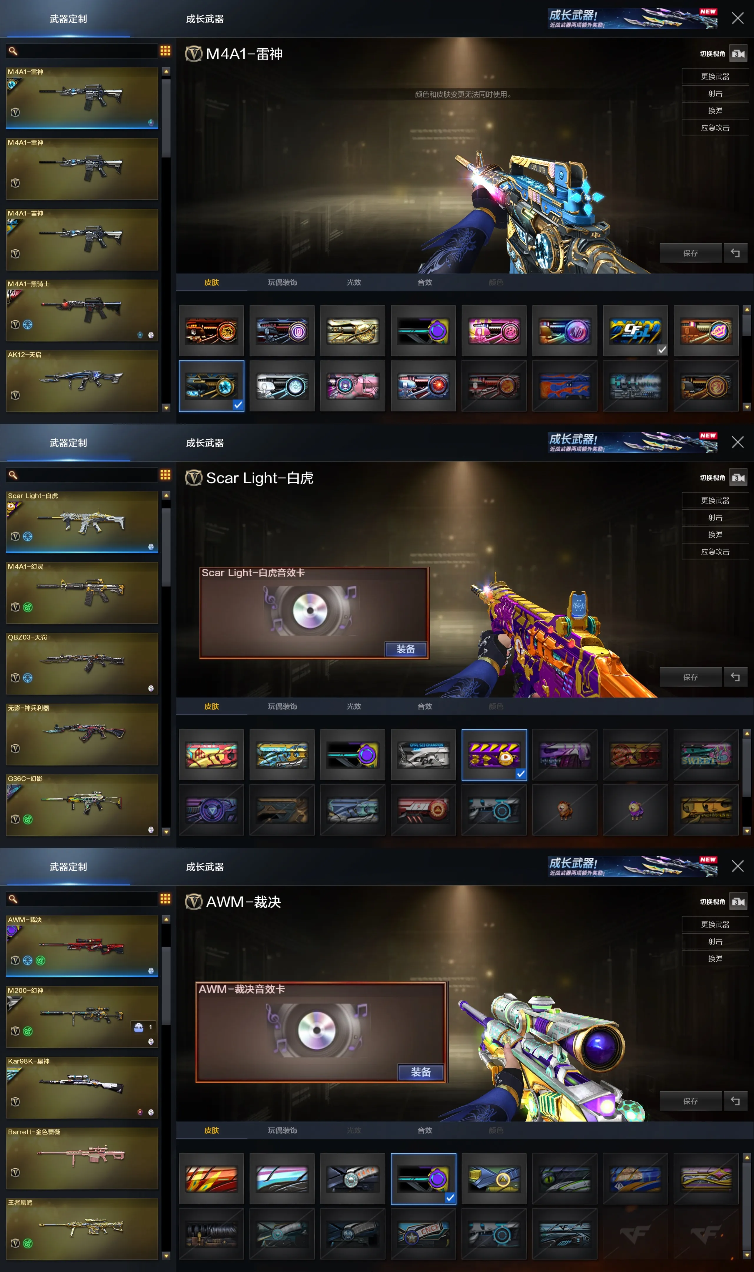 音效卡:G36C幻影音效卡,裁决音效卡,幻神音效卡,白虎音效卡,星神音效卡,毁灭音效卡,金色蔷薇音效卡,黑骑士音效卡,天罚音效卡