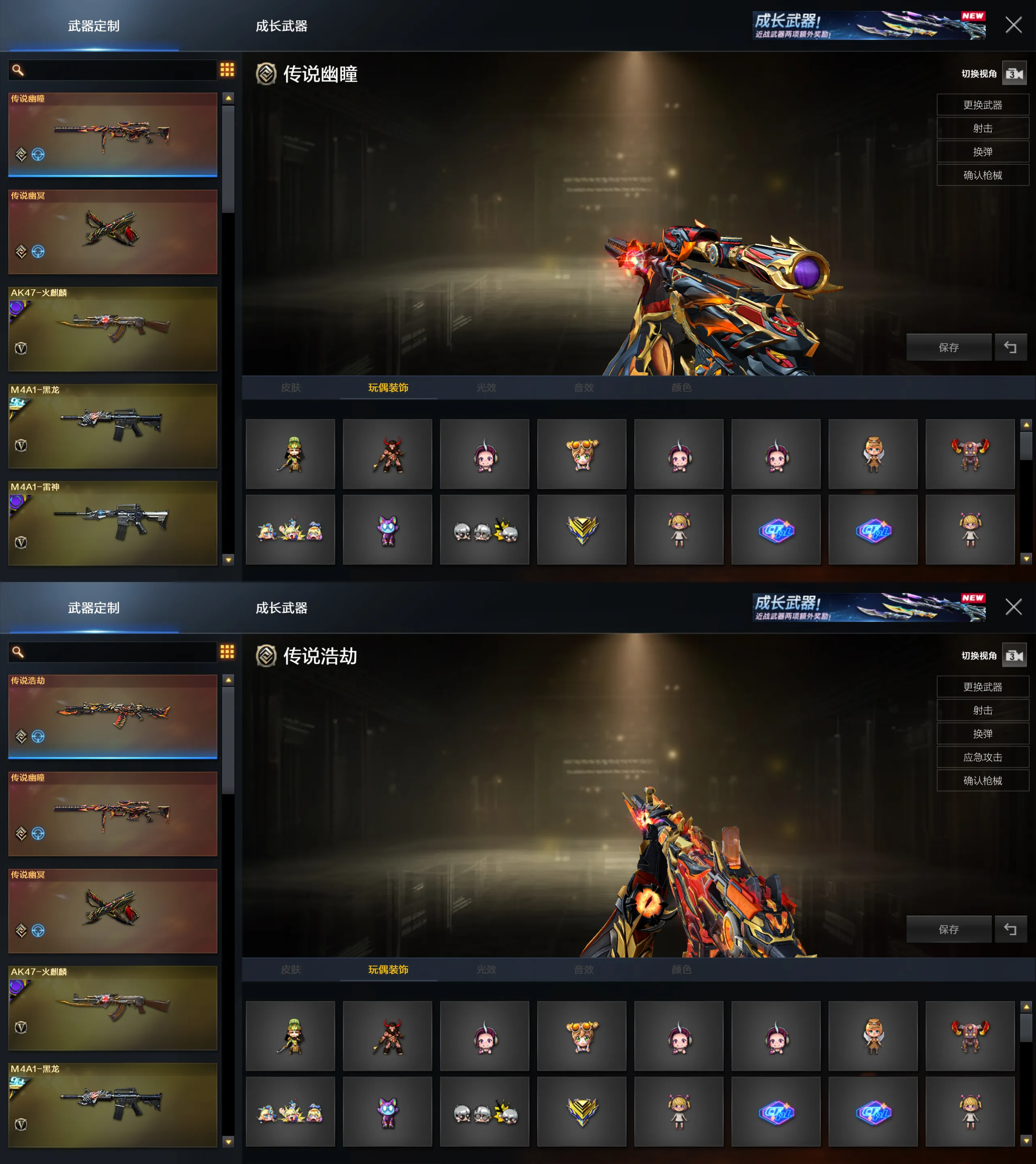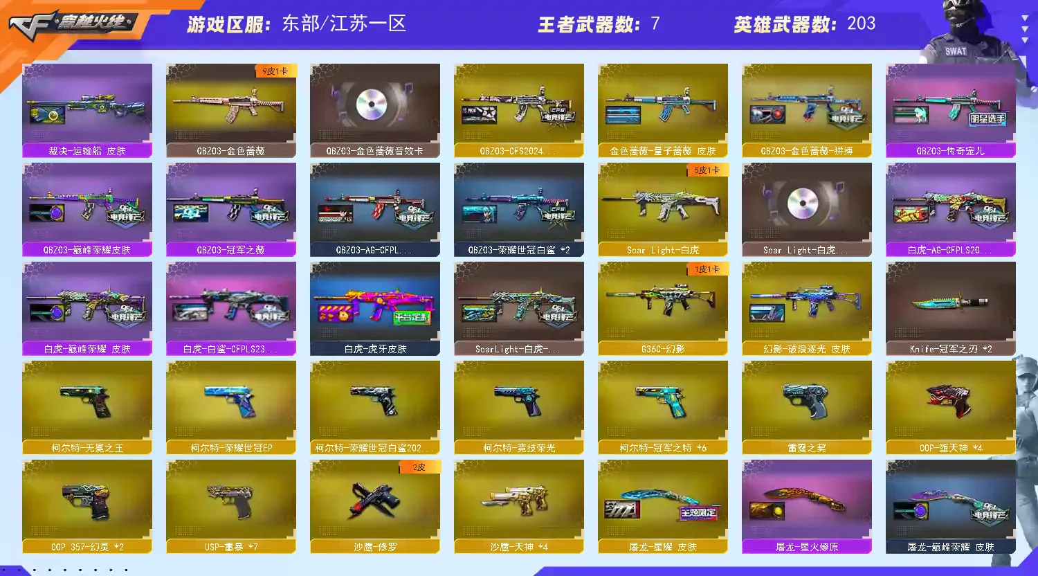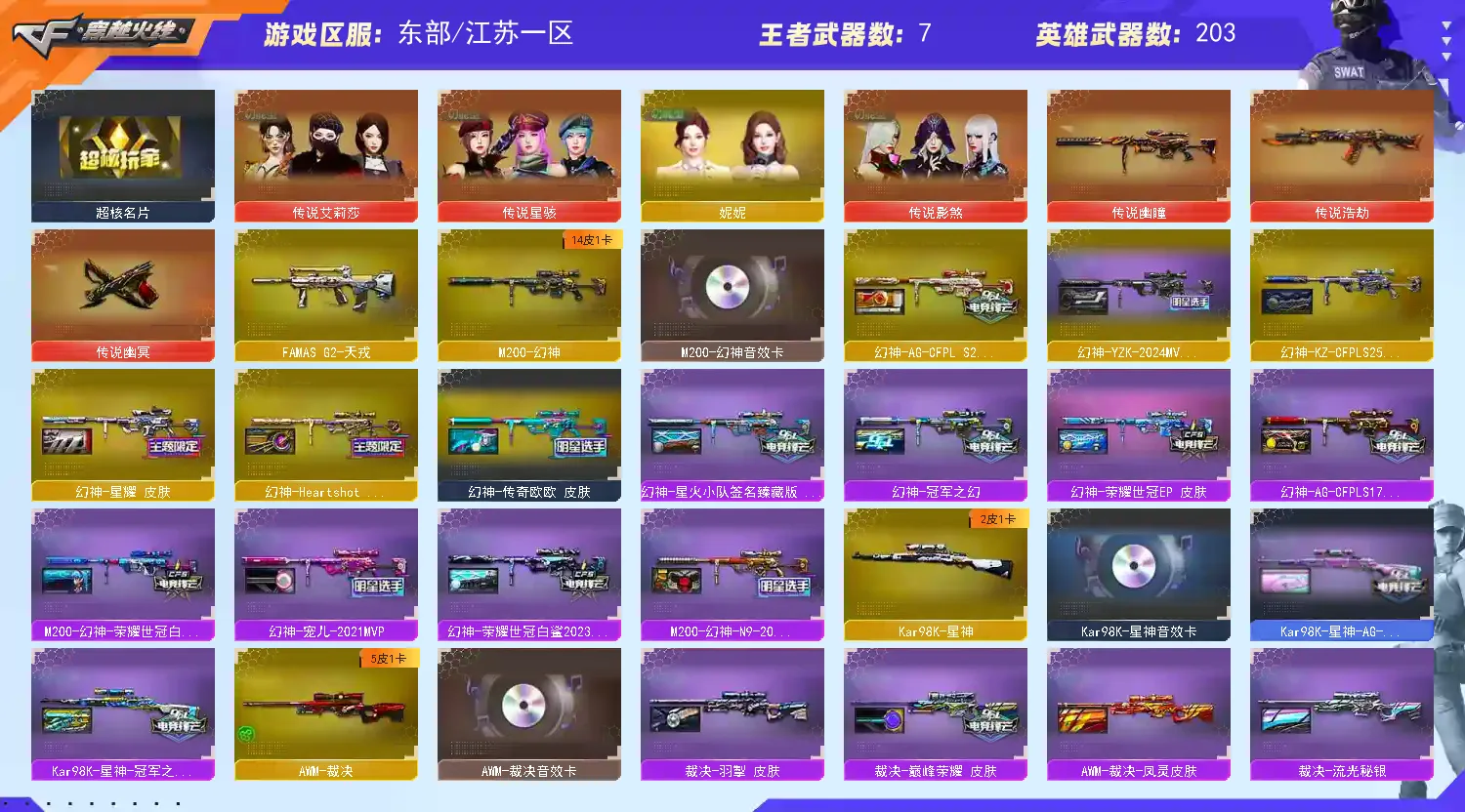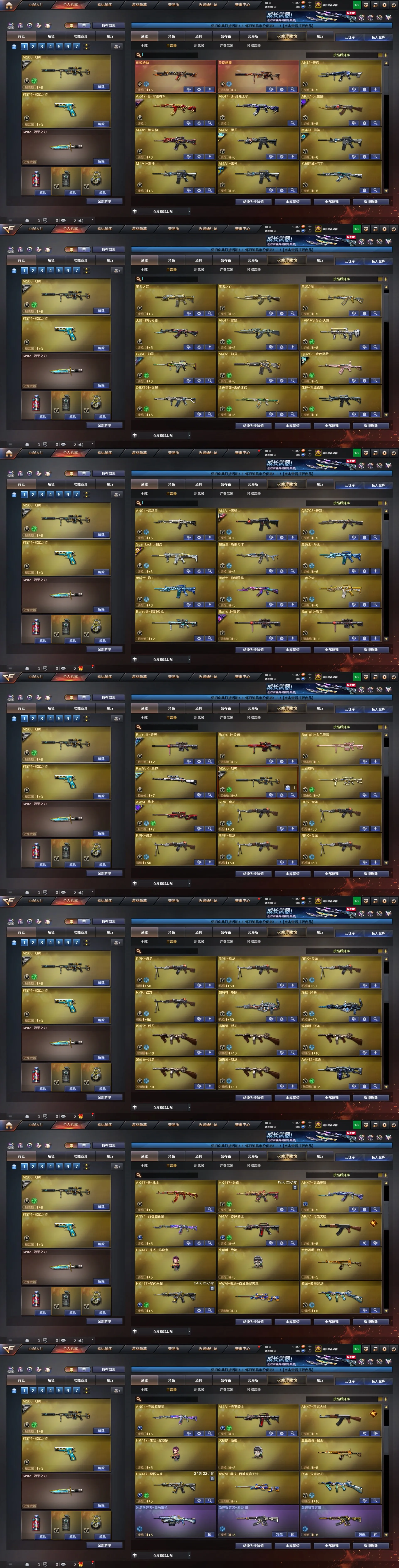 主武器:传说浩劫,异变清道夫蛇影双娇×2,FAMAS G2-天戎,QBZ03-天罚,传说幽曈,QBZ191银翼游侠,G36C幻影,火麒麟,雷神×2,白虎,M4A1幻灵,无影-神兵利器,QBZ金色蔷薇,觉醒版王者之影,觉醒版王者之武,黑骑士海王,毁灭,裁决,幻神,星神,巴雷特暗夜传说,炼狱,炼狱风暴,AA12雷霆,火麒麟绝迹,觉醒版王者凰鸣,M14EB4冠军金牛,烈龙×6,盘龙×6,巴雷特金色蔷薇,觉醒版王者之势,极光,AK47雷暴,黑龙,M4A4堕天神,巴雷特零水下丽影,AN94超新星,AK12天启,M4A1黑骑士