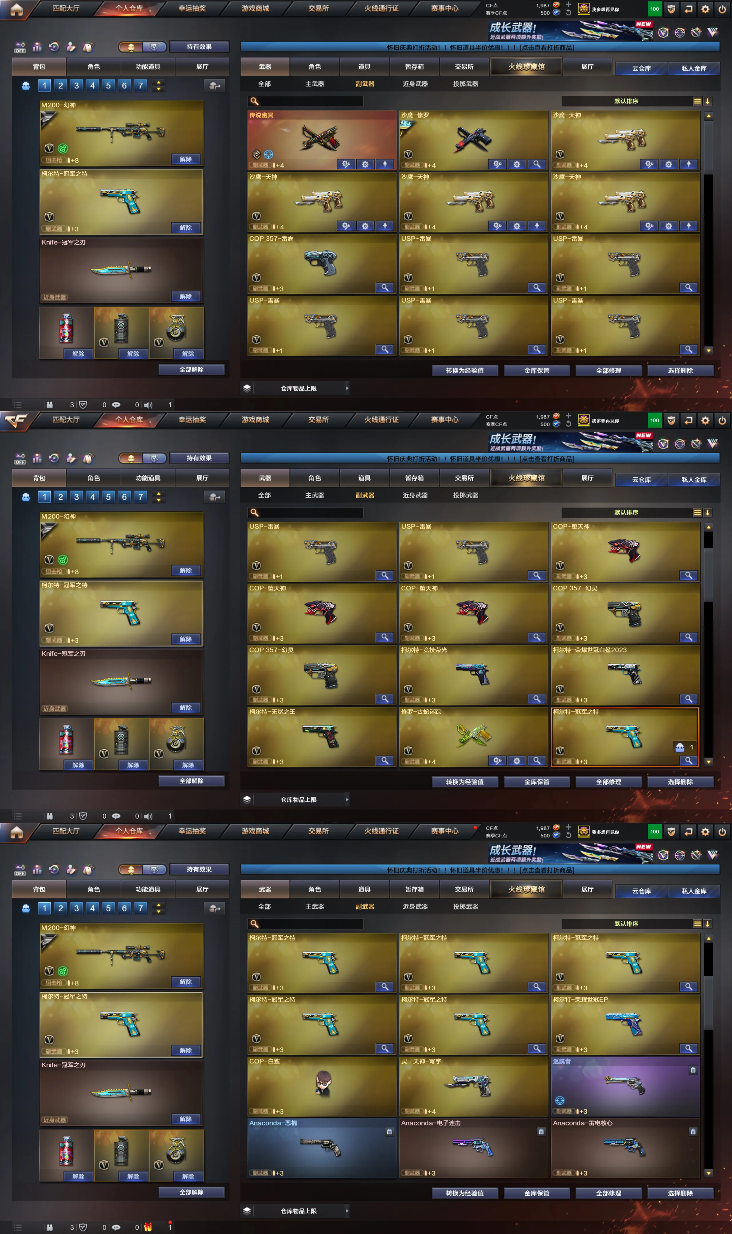 副武器:柯尔特-荣耀世冠EP,EPUSP雷暴×7,COP雷霆,修罗,COP幻灵×2,冠军之特×6,COP白鲨,天神×2,柯尔特无冕之王,COP堕天神×4,柯尔特竞技荣光,传说幽冥,柯尔特荣耀世冠白鲨2023