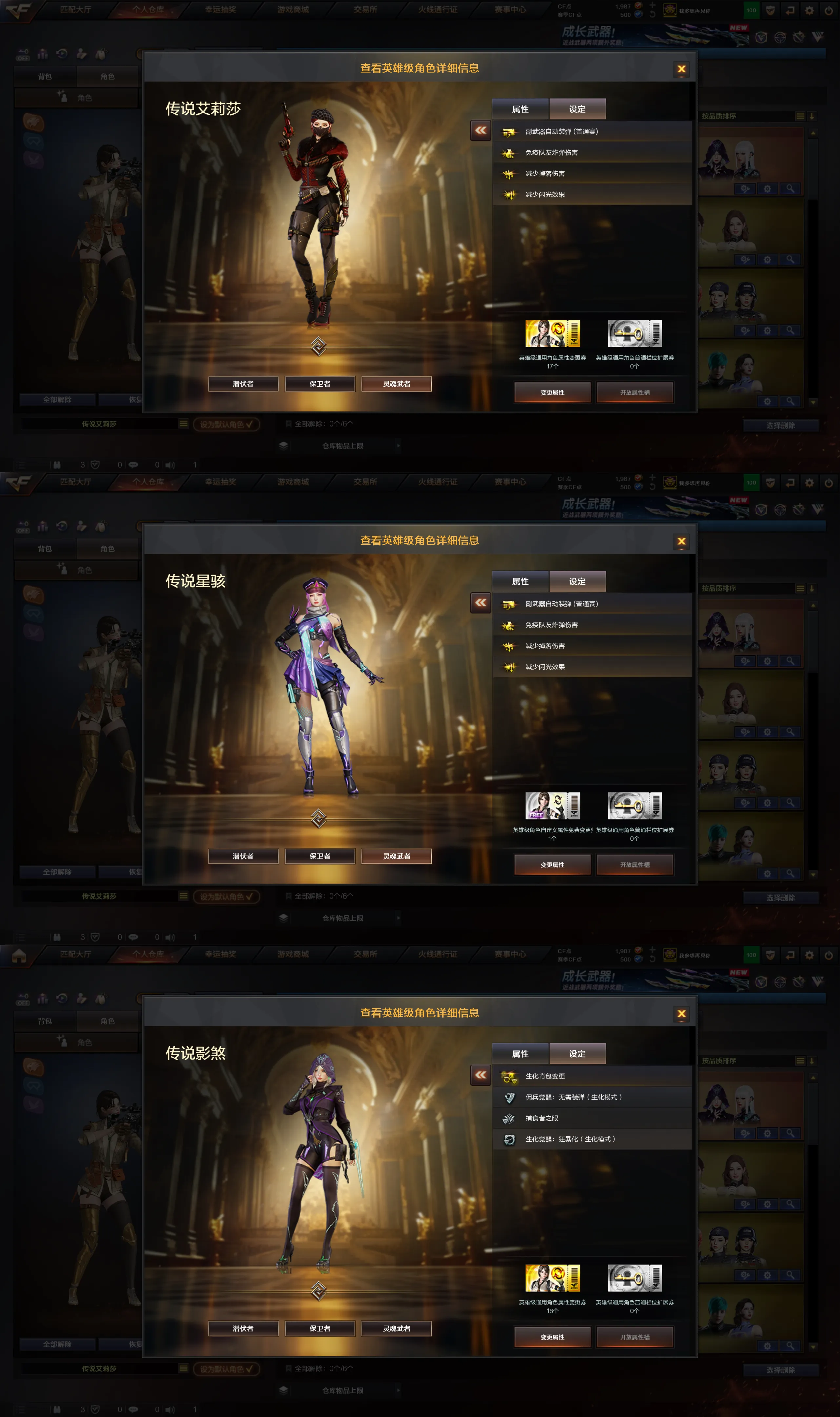 角色:传说艾丽莎(爆破四防),妮妮(爆破四防),传说星骸(爆破四防),传说影煞(生化四防),王者葵貂蝉(爆破四防),王者葵惊若翩鸿(爆破四防),王者玲珑小乔(生化四防),影豹(生化四防),岚兮儿(爆破四防),龙儿小淘气(爆破三防),新灵狐者(爆破三防),暗夜审判(爆破三防),灵动武士(爆破三防),春(爆破三防),炫(爆破三防),迷迭香(爆破三防),司雨(爆破三防),星际战将(爆破三防),关小雨(爆破三防),炽天使(爆破双防)