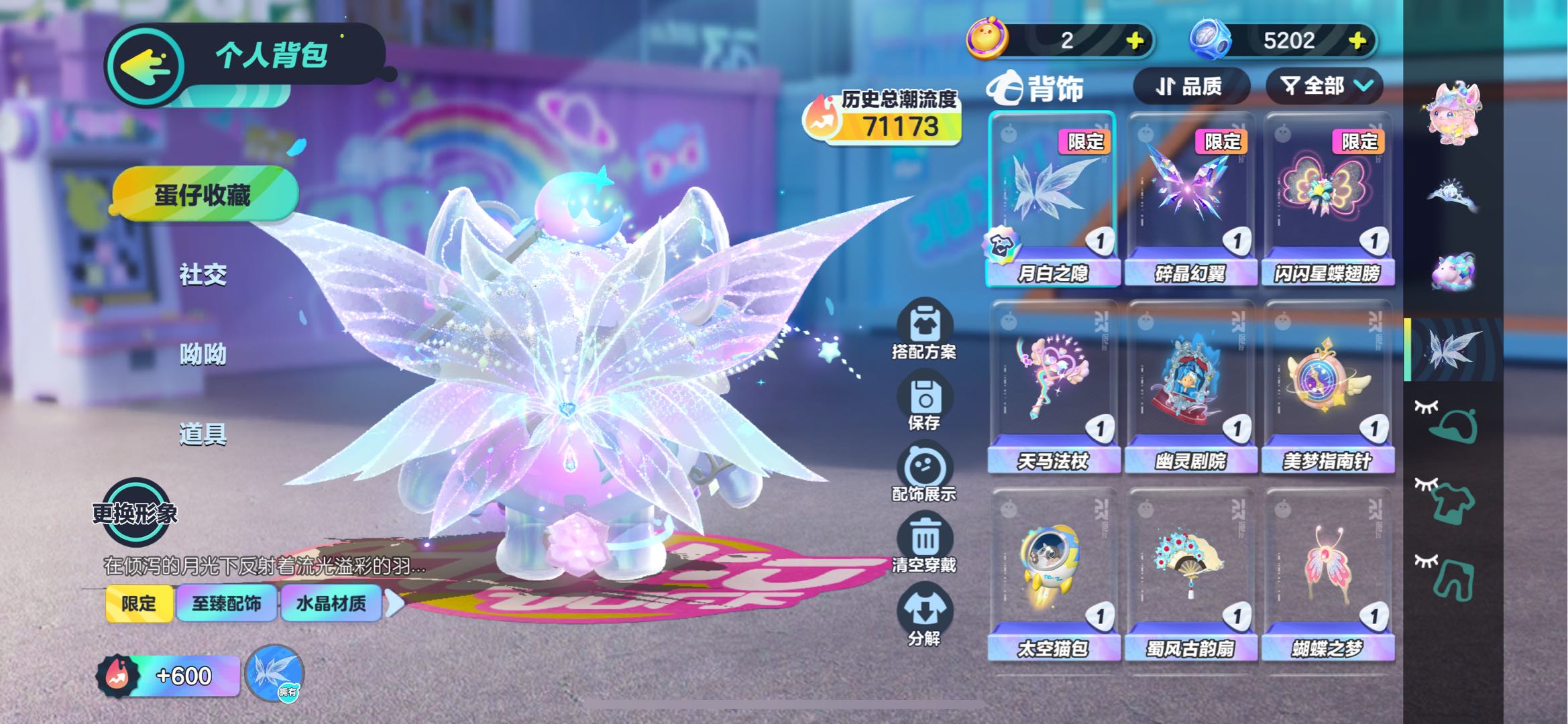 至臻配饰:月白之隐 闪闪星蝶翅膀 碎晶幻翼 绘山河折扇 蝴蝶之梦 蜀风古韵扇 太空猫包 美梦指南针 幽灵剧院 天马法杖 彩虹独角兽 魔法药水 烟袅玉佩 月球小夜灯 太阳神鸟挂坠 星星糖罐 幽冥烛台 烟隐山云眼镜 幻蝶面饰 丛林霸主面具 星河之轨 流星眼镜 跃火星点 魅影面具 梦幻天马头冠 南红玛瑙眼镜 独角兽眼罩 白蔷薇轮盘眼镜