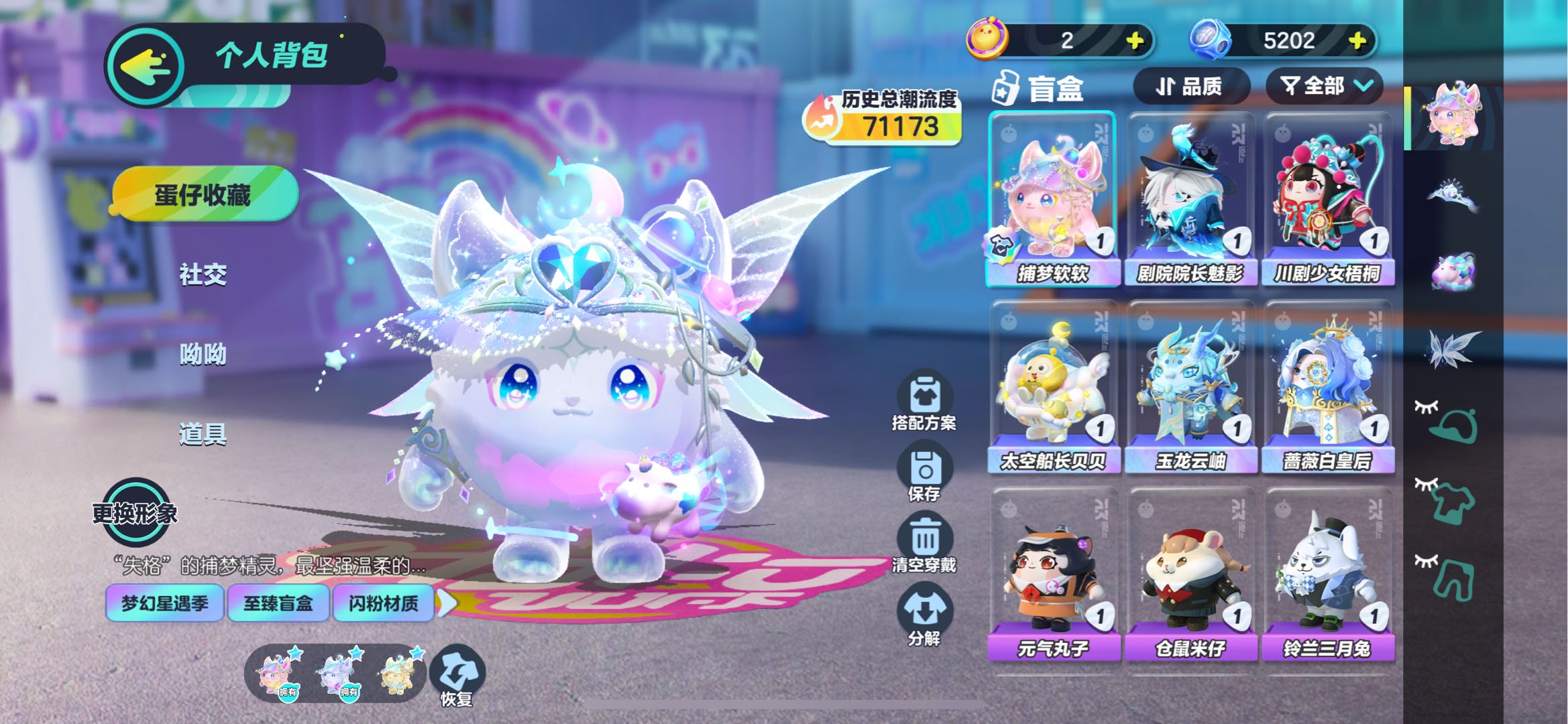 典藏:萤火偷偷 甲龙晶晶 催眠师困困 航天员莱卡 机械师维迪 菜鸟笨笨 仙人掌丘丘 狸猫大力 小猪妖 僵尸博士 熊猫岁岁 盖碗茶青青 彩虹水波蛋 流浪小象哆哆 玫瑰骑士 星云咩咩 雪王 海藻偷偷 迪迦 渔女 食梦公爵莱斯 白羽仙女索菲 刺猬绷绷 洗澡DUCKOO 魔灯闪闪 小灰灰 美羊羊 松鼠多栗 小演员露希 蓝舞鞋瑞拉 铃兰三月兔 道具师芙芙 北极兔卢米 极光女神典伊 吟游诗人弥亚 DongDong 仓鼠米仔 飞天小猪班尼 饶舌诗人 狐狸公子 旱獭 菠萝苏苏 蓝樱爱丽丝 元气丸子 小太阳葵葵 涂山浅浅 貔貅福福 佣兵 八音盒温妮