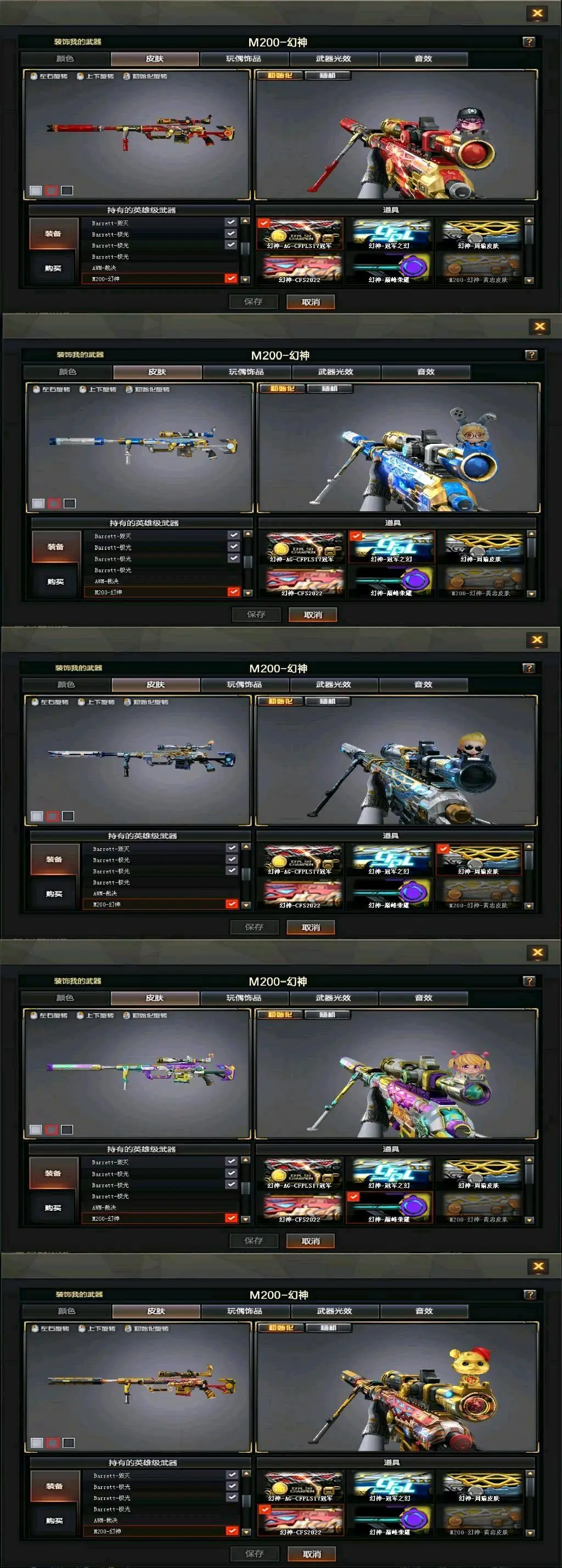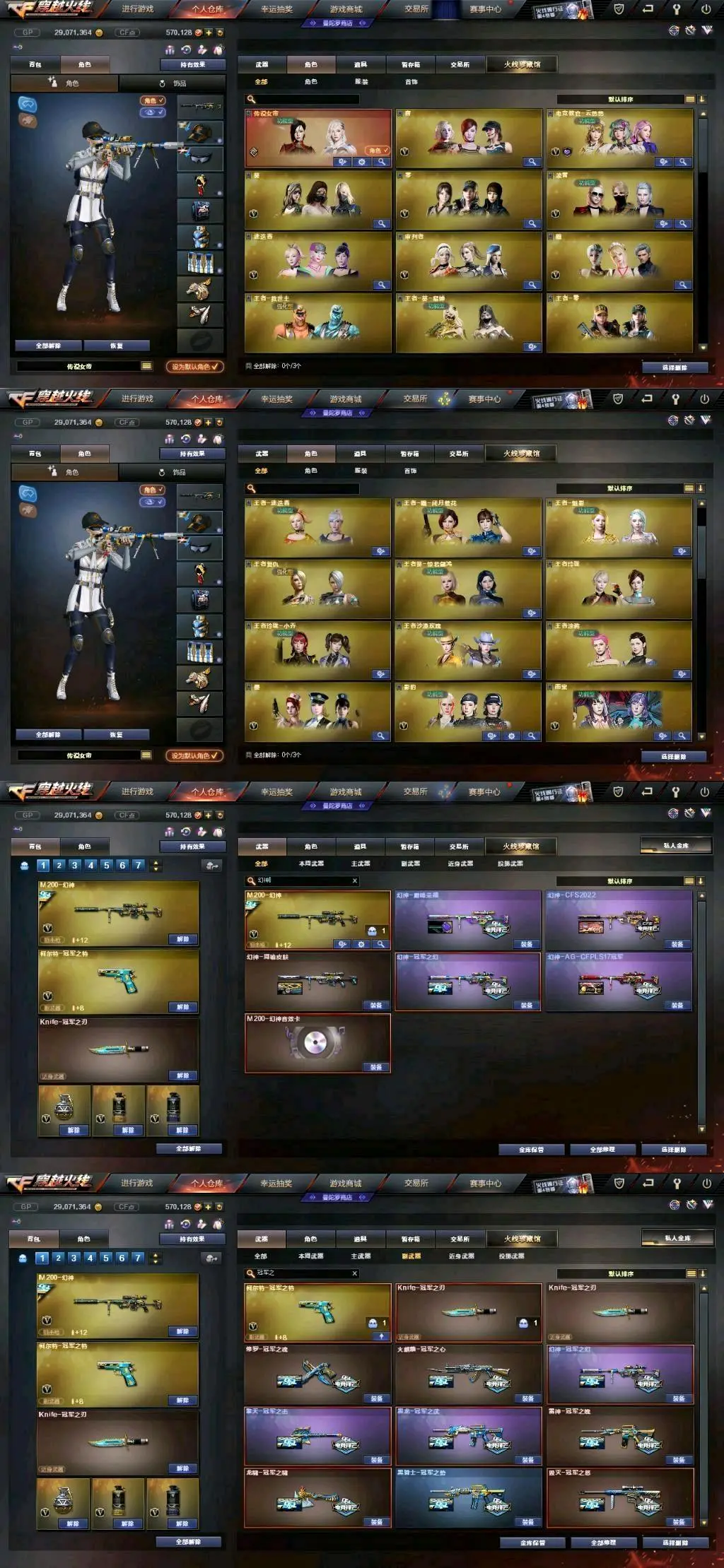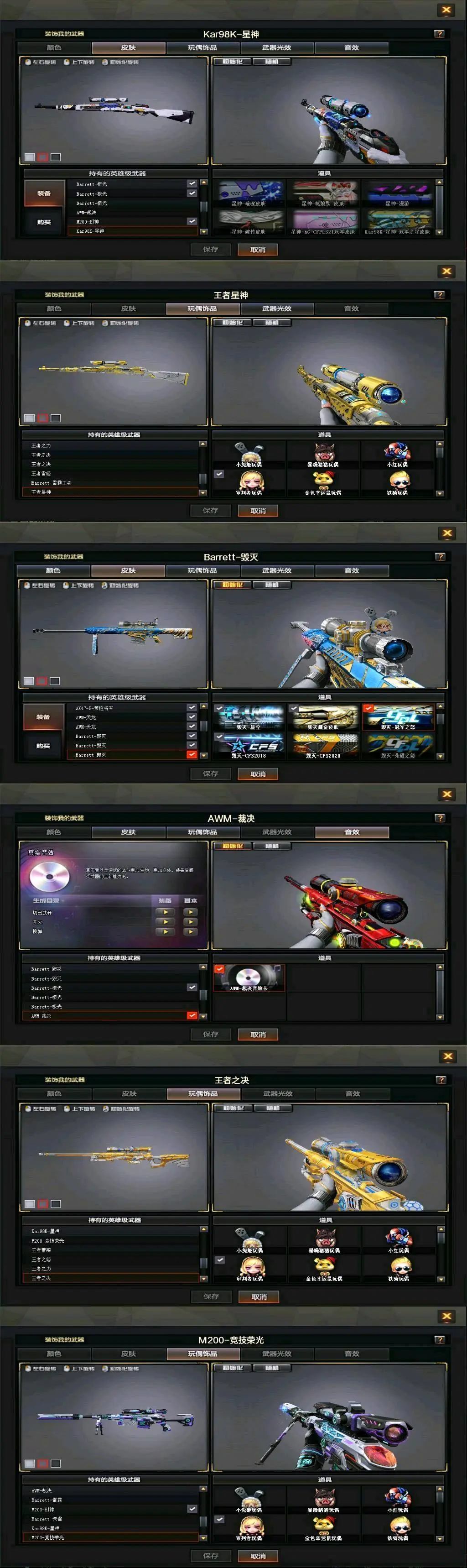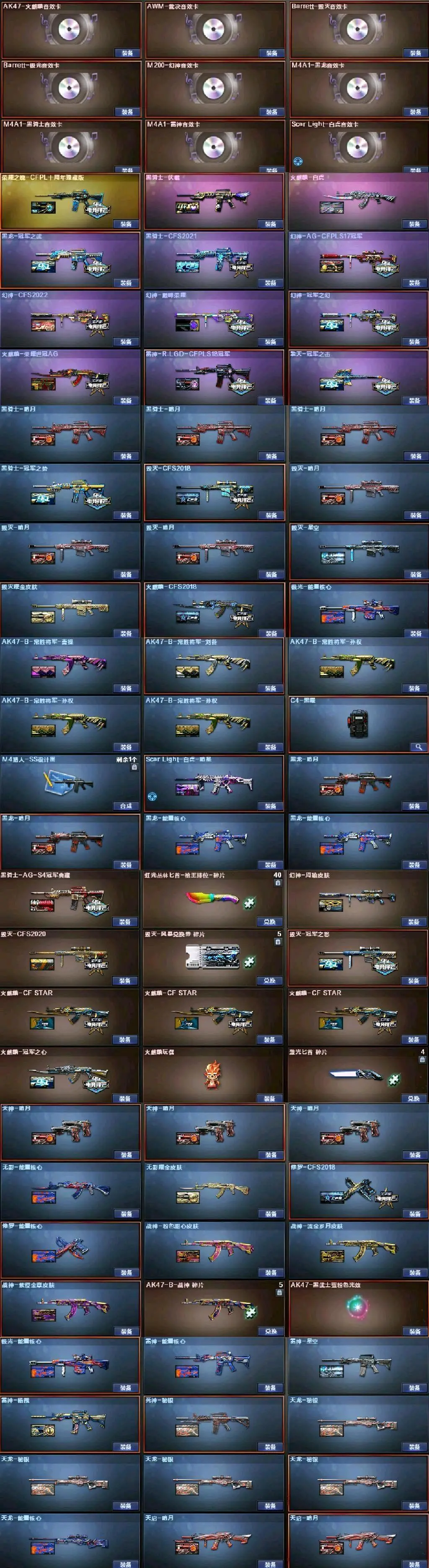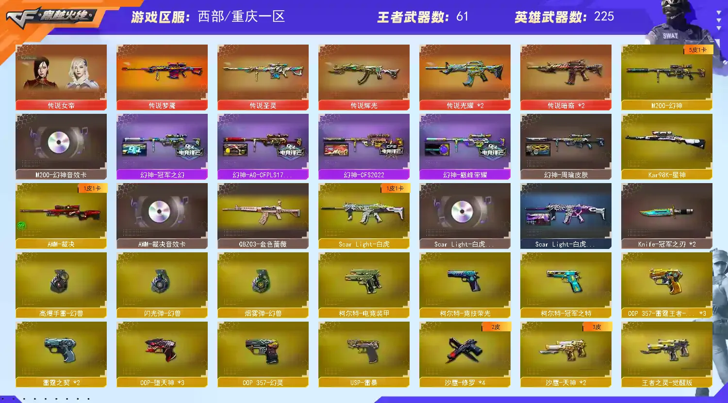 传说女帝+幻神三件套+巅峰荣耀(皮)+cf2022(皮)+周瑜(皮)+冠军之势(皮)+AG S17冠军(皮)+冠军之薇+冠军之特+冠军之刃(2)+黄金猫猫手套+春+云悠悠+王者沙漠玫瑰+影豹+凌霄+8传说武器(传说光耀序列号×2+传说暗裔×2+传说圣灵+传说辉光+传说梦魇)+星神+王者星神+竞技荣光套+雷暴套+雷霆套+堕天神套+夜魔套+6烈龙+斯太尔蝴蝶+6盘龙8炼狱(悦蓝)+幻灵套+白虎+皮+音效卡+王者白虎+qbz+王者qbz蔷薇等等,音效卡基本每把武器都有!还有很多就不一一描述了,武器、皮肤、音效卡具体看图吧!(图4、图5、图6、图7、图9、图10图片过长,需要往下拉才能看到下面的皮肤截图)