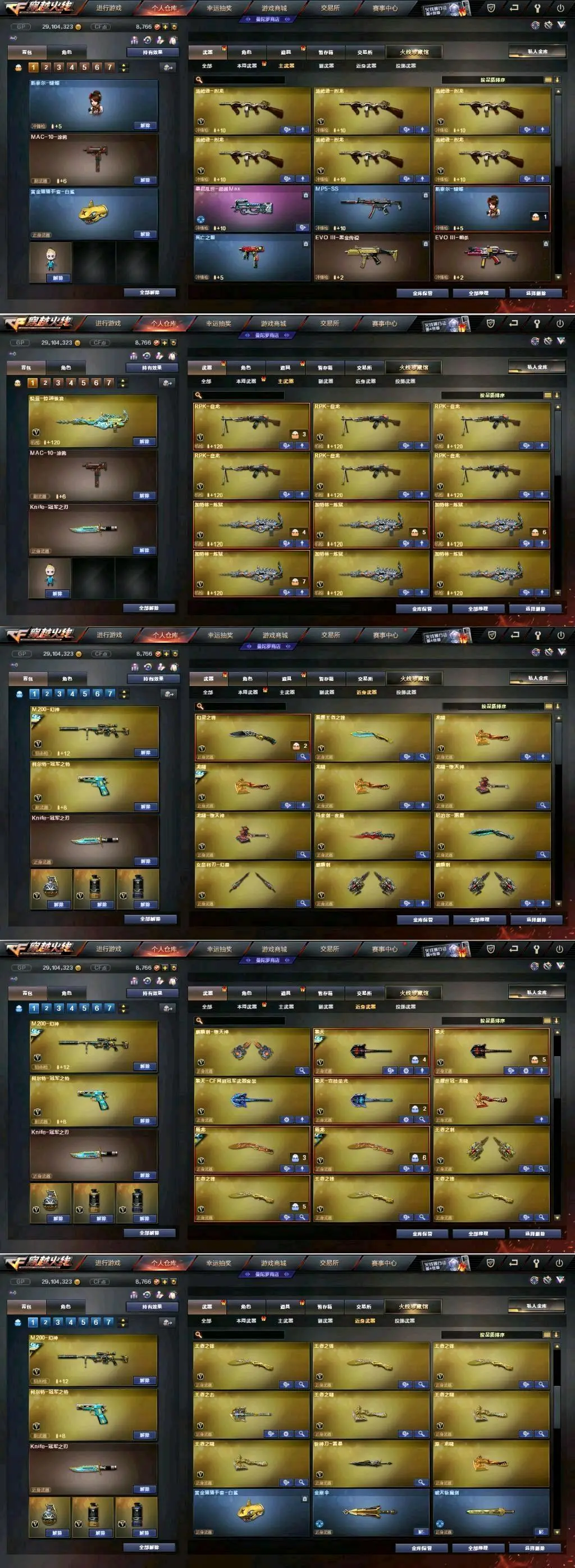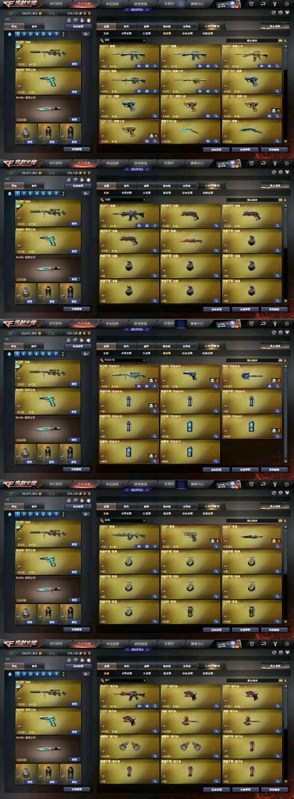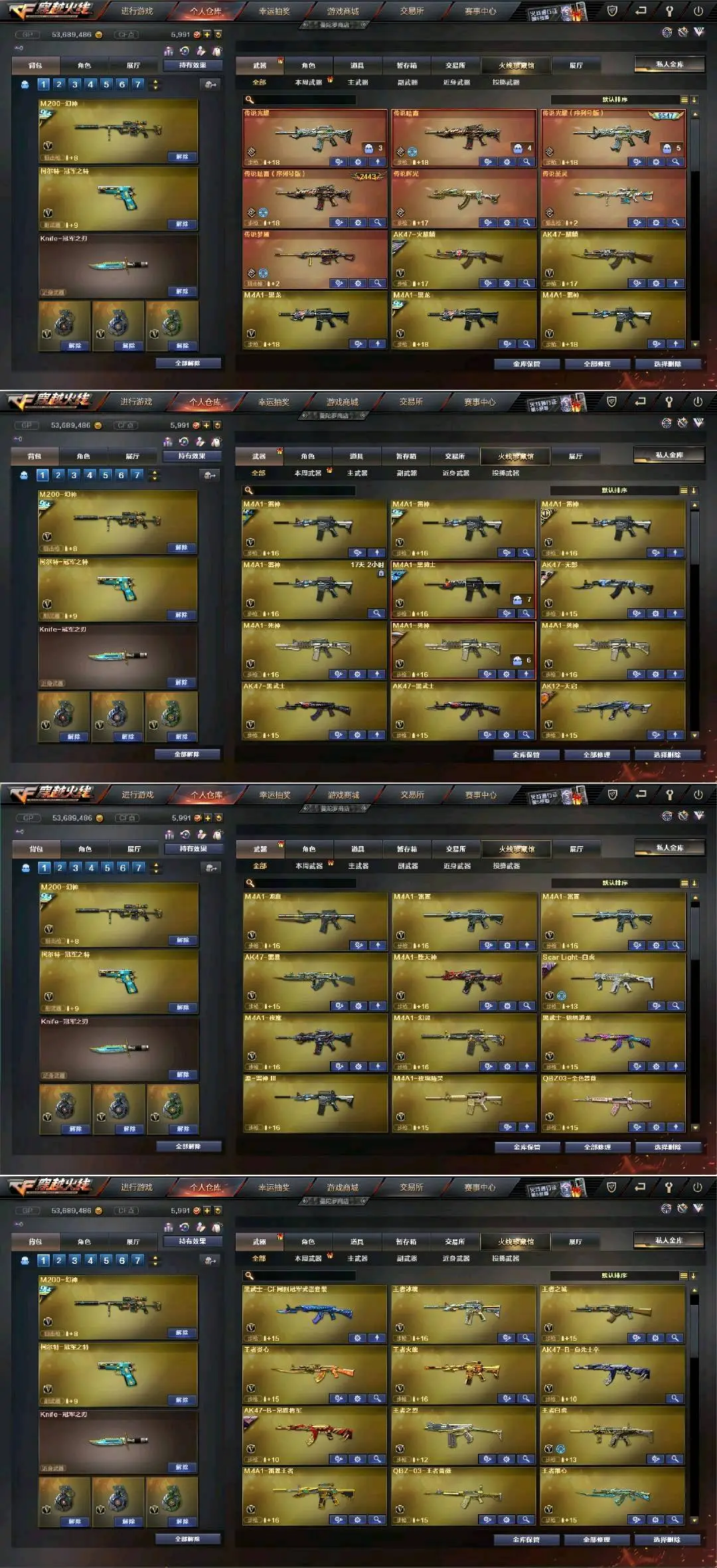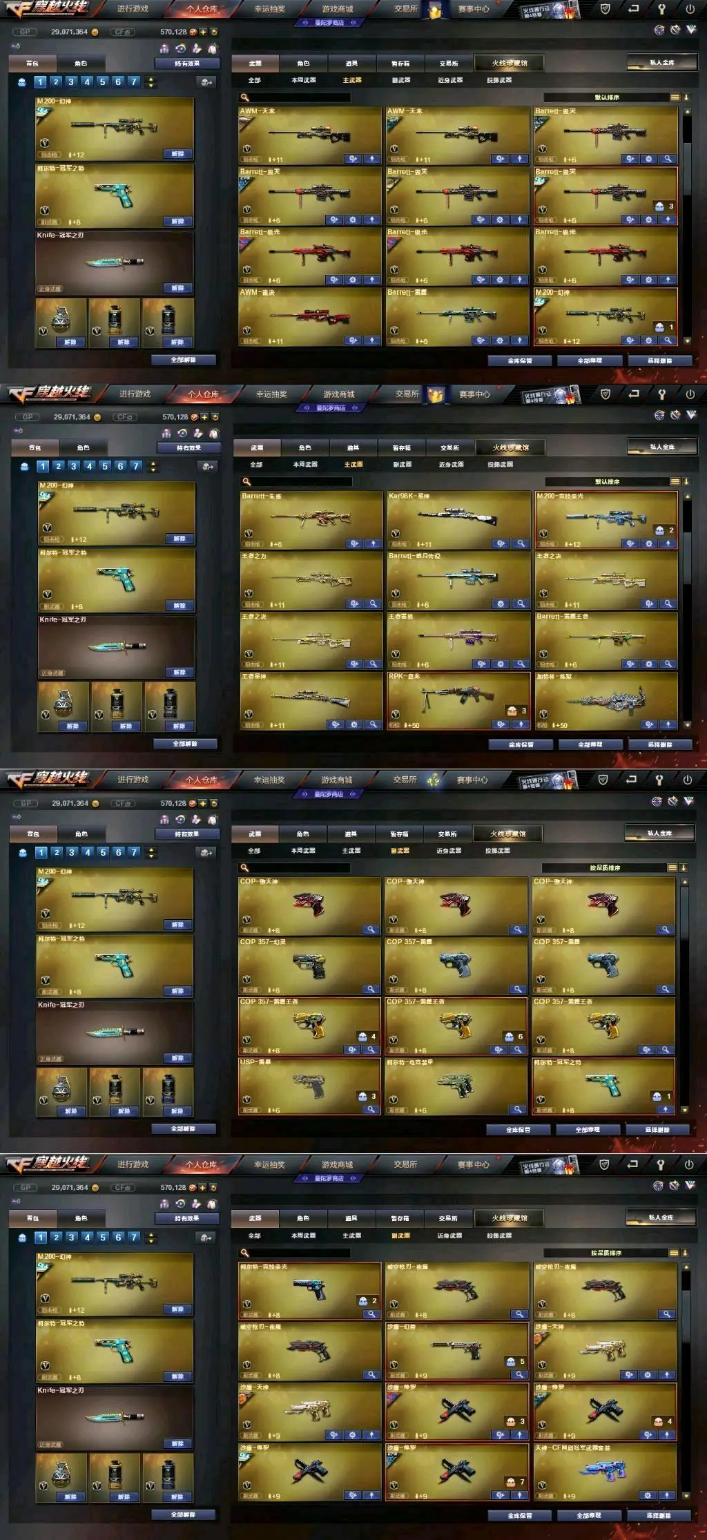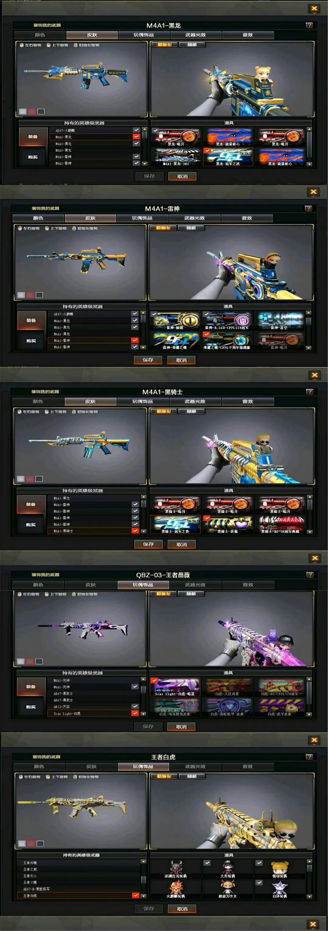 传说女帝+幻神三件套+巅峰荣耀(皮)+cf2022(皮)+周瑜(皮)+冠军之势(皮)+AG S17冠军(皮)+冠军之薇+冠军之特+冠军之刃(2)+黄金猫猫手套+春+云悠悠+王者沙漠玫瑰+影豹+凌霄+8传说武器(传说光耀序列号×2+传说暗裔×2+传说圣灵+传说辉光+传说梦魇)+星神+王者星神+竞技荣光套+雷暴套+雷霆套+堕天神套+夜魔套+6烈龙+斯太尔蝴蝶+6盘龙8炼狱(悦蓝)+幻灵套+白虎+皮+音效卡+王者白虎+qbz+王者qbz蔷薇等等,音效卡基本每把武器都有!还有很多就不一一描述了,武器、皮肤、音效卡具体看图吧!(图4、图5、图6、图7、图9、图10图片过长,需要往下拉才能看到下面的皮肤截图)