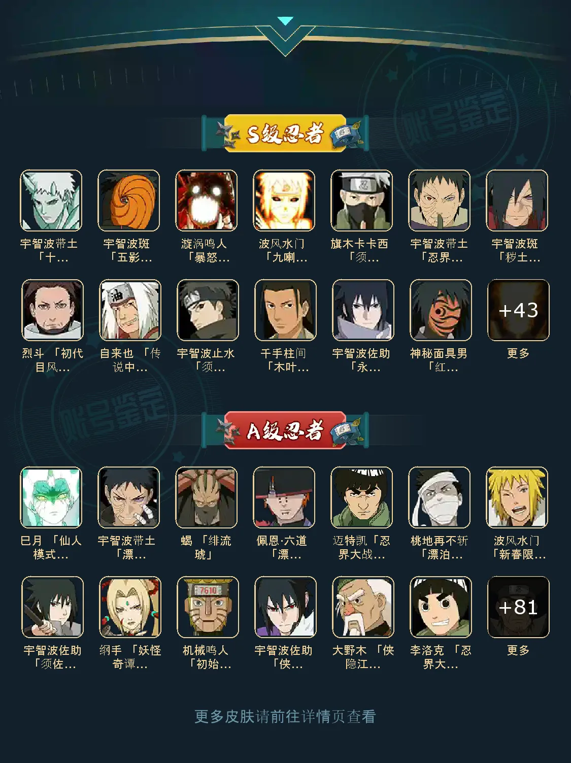仙人自来也 纲手 波风水门 百战水门 猿飞日斩 千手柱间 宇智波斑 宇智波鼬 舞之自来也 大蛇丸 百战大蛇 秽土四代 秽土三代 秽土长门 仙人兜 黄猿九喇嘛鸣人 紫狗永恒佐助 樱婊忍战樱 秽土鼬 普通自来也 百豪纲手 死门凯 二代扉间 秽土二代 秽土初代 秽土柱间 白面具 须佐卡卡西 小胡子鬼灯幻月 雷影 土影 无 佩恩 百战佩恩 青年柱间 创立初代 秽土斑 青年斑 解斑 须佐止水 虎皮 破面带土 红夜带土 罗砂 秽土三代风影 忍战雷影 三代雷影 金角银角 秽土半藏 忍战大野木 小土豆 天道超 大筒木桃式 大筒木金式 钢铁之躯凯 桀骜之刃阿斯玛 狂野之鲨鬼鲛 飞段 黑飞段 百豪樱 忍战李 大卡卡西 五代水影照美冥 宇智波鼬 仙鸣 九尾查克拉鸣人 鹰佐 奇拉比 青年艾 半蛇兜 晓蛇 新春鼬 面麻 须佐佐助 疾风咒印佐助 忍战宁次 忍战天天 最终章雏田 幻容卡卡西 神卡 忍战卡卡西 泳装卡卡西 忍战凯 青春哥 惊门凯 爱情哥 新春止水 新春水门 青年水门 青水 新春我爱罗 泳装照美冥 侠隐照美冥 侠隐纲手 侠隐兜 漂泊再不斩 漂泊佩恩 漂泊二代 漂泊小南 漂泊佩恩 三船 青年三船 青年长门 泳装南 新春南 黑绝 新春大蛇丸 晓创生角度 晓创生蝎 晓创生飞段 泳装鼬 鲛肌融合鬼鲛 新春迪达拉 秽土迪达拉 恶灵之影飞段 暴怒带土 忍战黄土 卑留呼 桃博 黑土