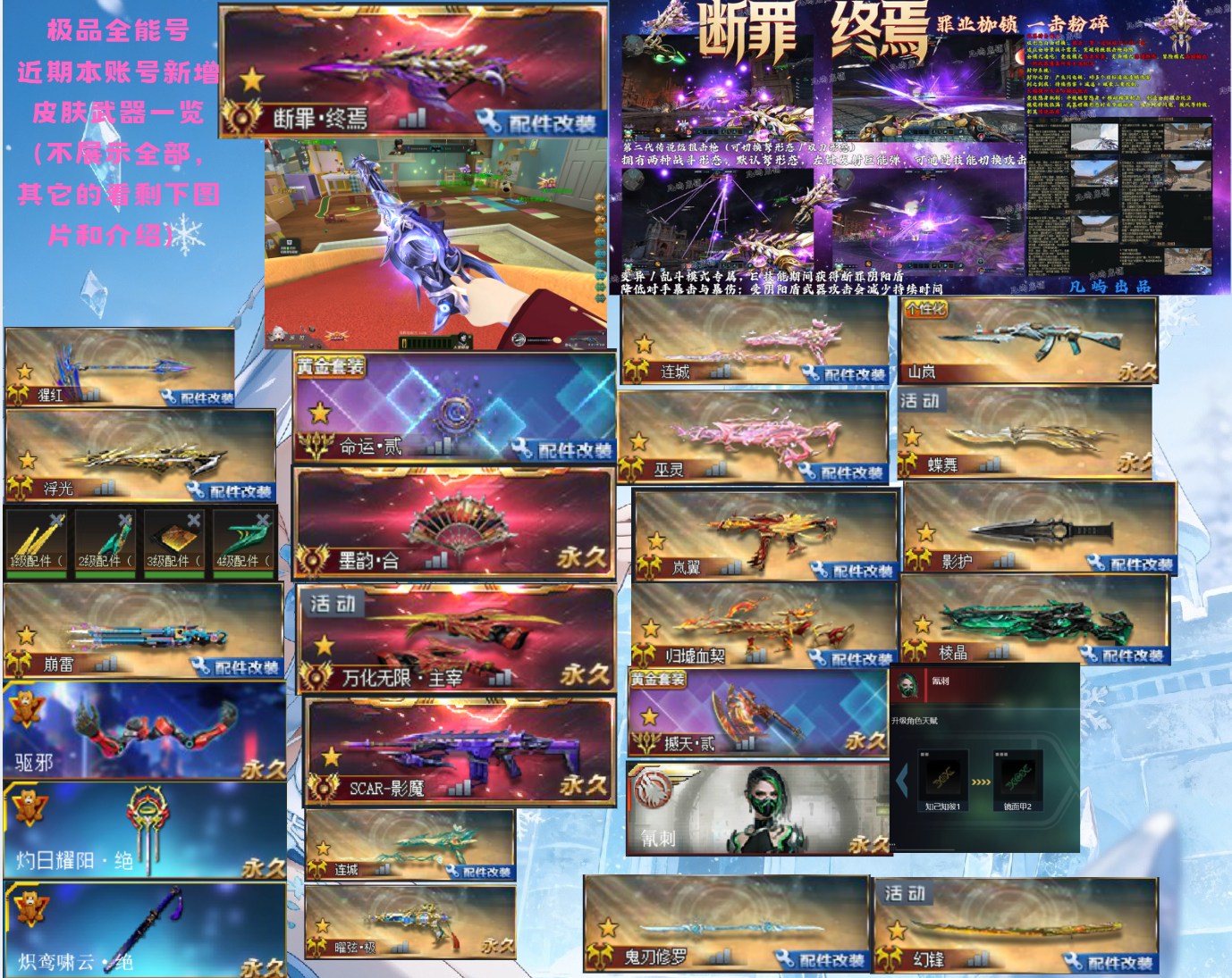 scar影魔未央,最新兑换卡武器满同步曜弦极,最新传说万化主宰,灼日耀阳绝饰品紫霞解锁海棠染色卡,满配件强化新配件猩红无限幻想皮肤,ak47荣耀山岚皮肤,破坏者,突破到境界2拿下恒星之主称号和非常好看的勋章,战力排行榜最高3500w战力,满同步巨阙500多符文最高一波打900京可以带龙息一套秒专家ai少女和海岛极速,新增十二时辰黄撕皮,ak皮,巴雷特皮,黯渊之翼,凝雨焚风