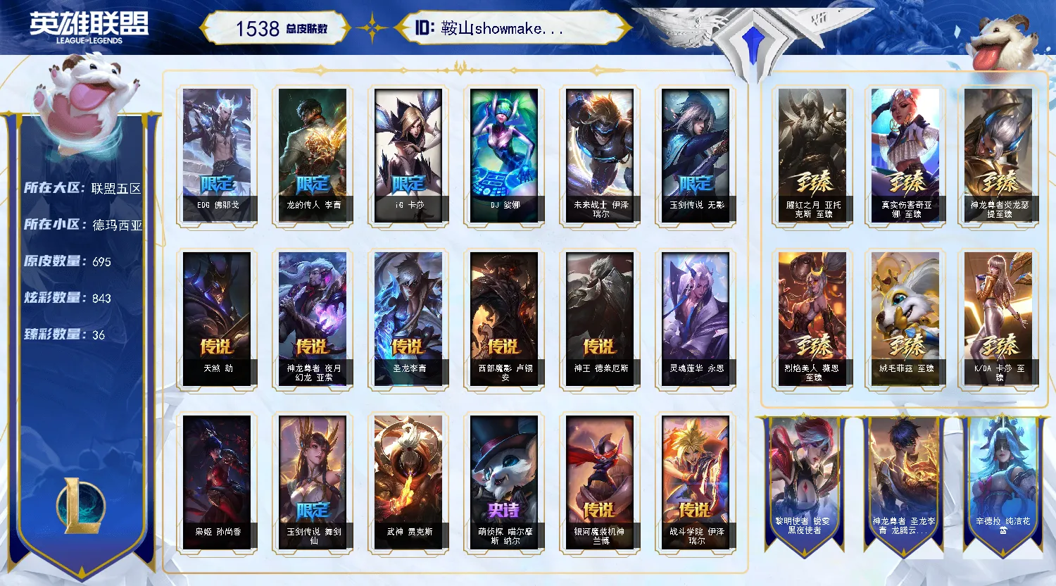 【德玛西亚638原皮36至臻8海克斯】至臻永恩丶至臻小丑丶至臻派克丶至臻墨之影武者亚索丶至臻男刀