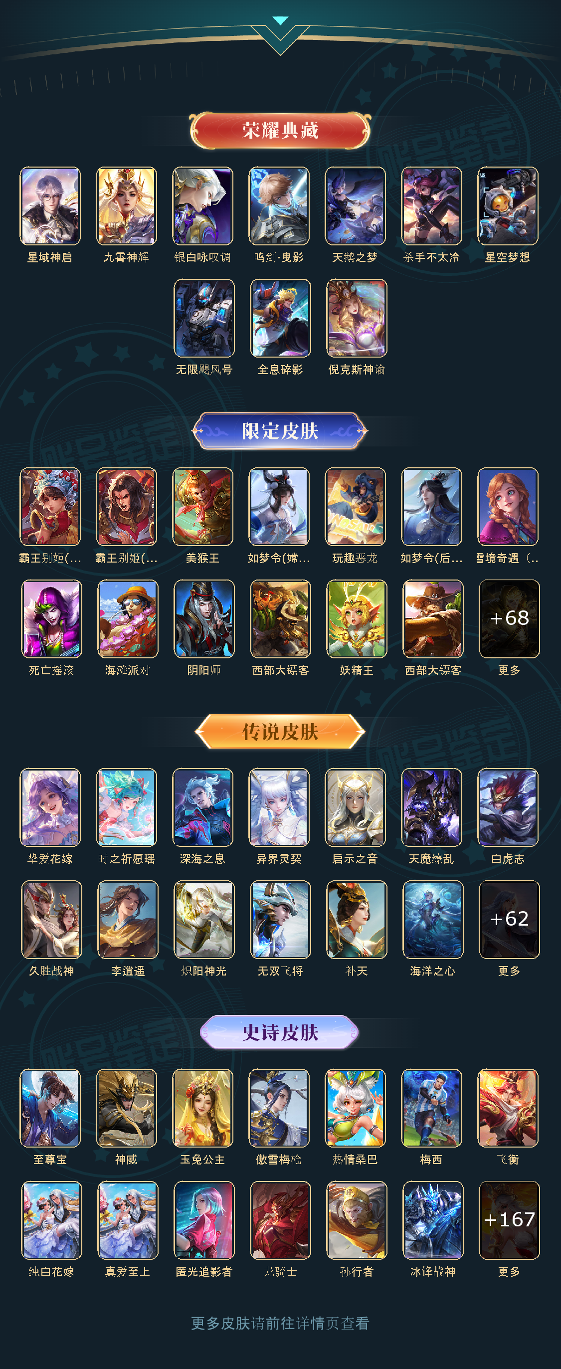 贵族等级V10,典藏皮肤数10,纯白花嫁/天魔缭乱/至尊宝/真爱至上/圣诞老人/热情桑巴/梅西/青龙志/白虎志/朱雀志/久胜战神/飞衡/倪克斯神谕/匿光追影者/鸣剑·曳影/星域神启/李逍遥/武圣/玉兔公主/补天/异界灵契/神威/启示之音/傲雪梅枪/时雨天司