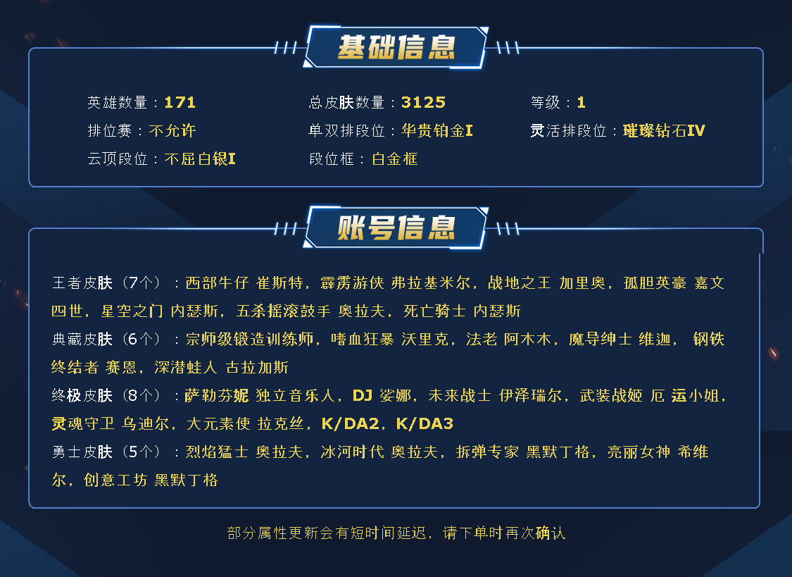 2660皮肤◆签名版名人堂阿狸◆全神话皮肤◆双炫彩龙瞎龙虾签◆蓝龙黑龙◆至臻◆摄魂VN◆花木兰◆吕布◆源代码◆安妮十周年◆至臻◆双城之战◆阿木木◆侍魂◆克格汪◆最终BOSS◆神凰行者◆SSW◆玉剑传说◆◆腥红之月◆福牛守护者◆欧米伽小队◆西部魔影◆未来战士◆沙之守护◆单身贵族◆防爆士兵◆电玩勇者◆血色之锤◆胜利机器人◆铁哥们◆鬼影重重◆女校长◆SKT◆恐惧新星◆丧尸◆死亡领主◆驯龙女巫◆主治医生◆银河魔装机神◆征服者◆等等等等【】