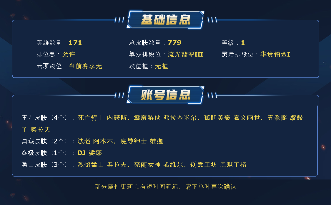 此号已在公安机关信息登记虚拟财产备案,租用期间禁止使用美化包第三方软件外挂等,如导致封号或冻结必将追究到底向平台找到下单IP、手机号实名、下单充值的实名找到本人法院传票到封号者家!把封号者起诉到法院追回账号损失切勿以身试法弄的大家都不好看!感谢支持与配合!根据《刑法》第二百七十五条故意毁坏财物罪:故意毁坏公私财物数额较大或者有其他严重情节的处三年以下有期徒刑、拘役或者罚金数额巨大或者有其他特别严重情节的处三年以上七年以下有期徒刑!切勿以身试法!