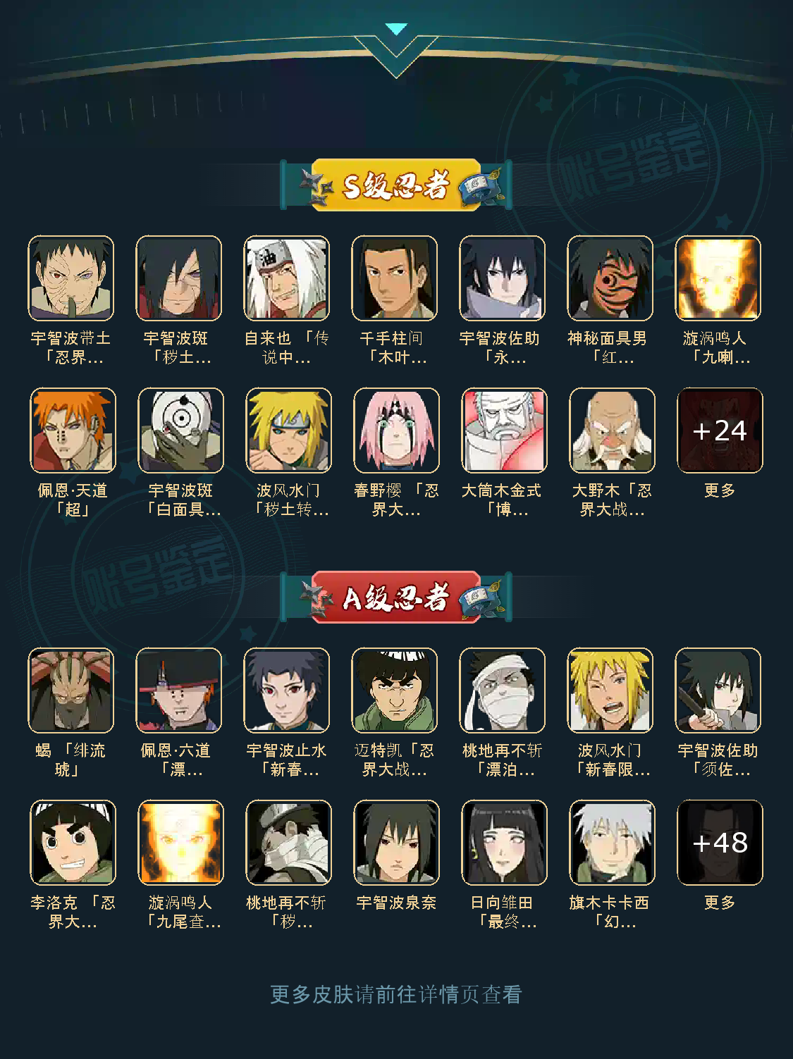 35S/53A//V13/ S忍;大蛇丸 九喇嘛 永恒佐助 忍战樱 自来也 蜀面 百豪纲手 纲手 死门凯 水门 秽土水门 秽土日斩 扉间 秽土扉间 创立柱间 秽土柱间 斑 秽土斑 解斑 创立斑 须佐鼬 秽土鼬 白面具