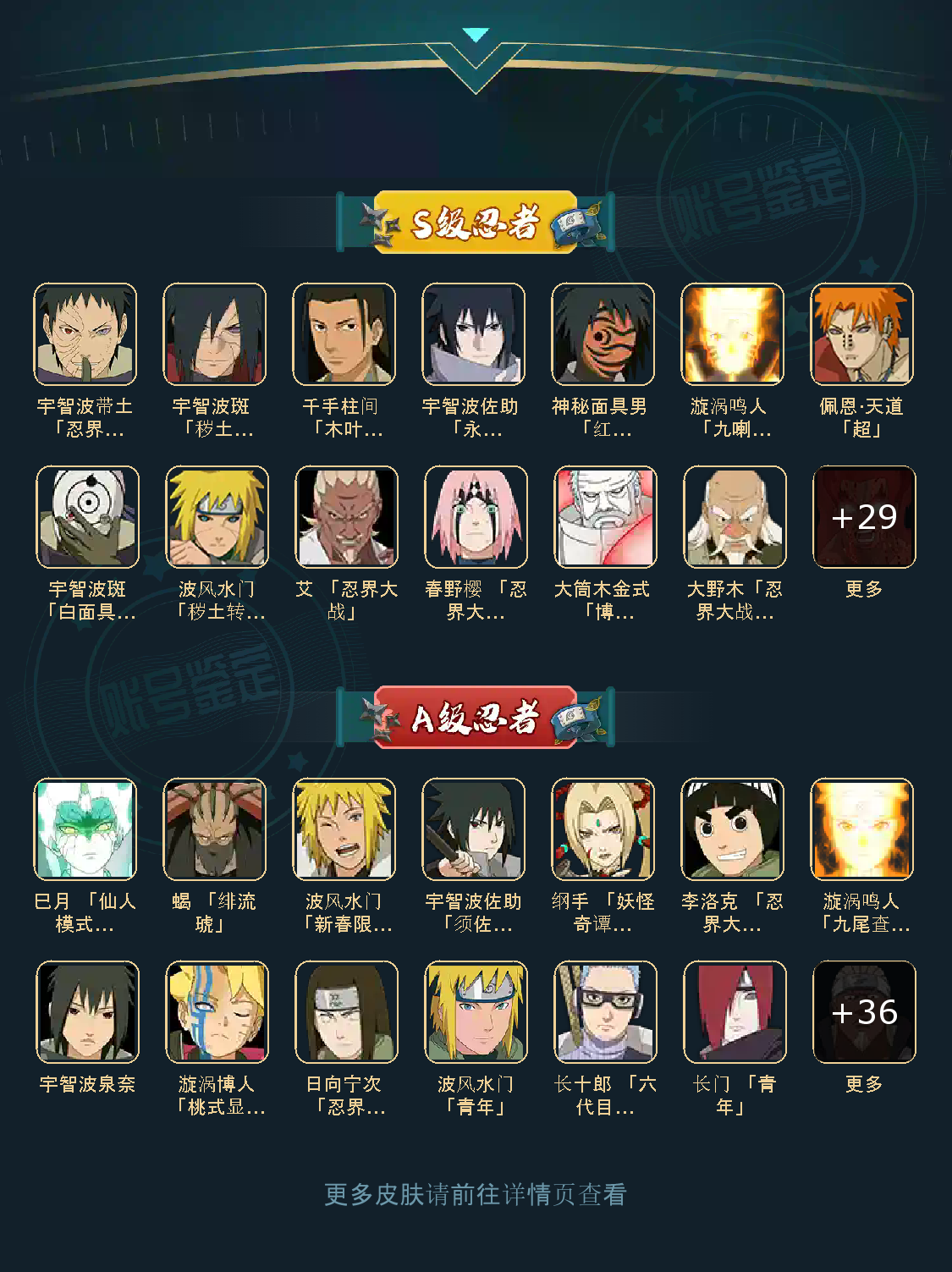 战力:1825W+;VIP13级;S忍41个;A忍42个,通灵兽22个,S忍:5星纲手(普通),4星仙人模式自来也,4星大蛇丸,4星猿飞日斩(普通),九喇嘛连结漩涡鸣人,永恒万花筒宇智波佐助,忍界大战春野樱,百豪纲手,自来也(普通),舞之豪杰自来也,死门迈特凯,波风水门(普通),秽土转生波风水门,秽土转生猿飞日斩,秽土转生千手扉间,千手扉间(普通),千手柱间(普通),木叶创立千手柱间,秽土转生千手柱间,秽土转生宇智波斑,木叶创立宇智波斑,秽土转生解宇智波斑,须佐能乎宇智波鼬,秽土转生宇智波鼬,神秘面具男(普通),白面具宇智波斑,忍界大战宇智波带土,红夜之刃神秘面具男,四代目风影罗砂,二代目水影鬼灯幻月,三代目雷影艾,三代目土影大野木,忍界大战大野木,秽土转生半藏,二代目土影无,超佩恩天道,秽土转生长门,仙人模式药师兜,博人传大筒木金式, ;A忍:5星迈特凯(普通),5星猿飞阿斯玛(普通),5星蝎(普通),5星干柿鬼鲛(普通),4星疾风传我爱罗,4星飞段(普通),3星青年艾,3星须佐能乎宇智波佐助,3星死司凭血飞段,万花筒写轮眼宇智波佐助,忍界大战日向宁次,宇智波止水(普通),近松十人卫千代,百豪春野樱,九尾查克拉漩涡鸣人,万花筒写轮眼旗木卡卡西,新春限定波风水门,青年波风水门,忍界大战我爱罗,忍界大战秋道丁次,仙人模式漩涡鸣人,青年长门,晓大蛇丸,新春限定宇智波鼬,木叶上忍猿飞木叶丸,五代目水影照美冥,角都(普通),忍界大战奇拉比,加藤断,宇智波鼬(普通),迪达拉(普通),漂泊武士千手扉间,半蛇斗篷药师兜,新春限定小南,五代目雷影达鲁伊,秽土转生迪达拉,暴怒宇智波带土,六代目水影长十郎,奇拉比(普通),小南(普通),夏日泳装小南,四代目土影黑土, ;通灵兽:忍犬(普通),蓝蛇,蛤蟆吉,忍龟,猿魔,镰鼬,熊猫,山椒鱼,蛞蝓(普通),蜃,蛤蟆仙人,鲛鲨,蛤蟆龙,蛤蟆健,乌鸦,一尾守鹤,梦貘,二尾又旅,蛤蟆广,鹰,怒鬼爪,蜘蛛