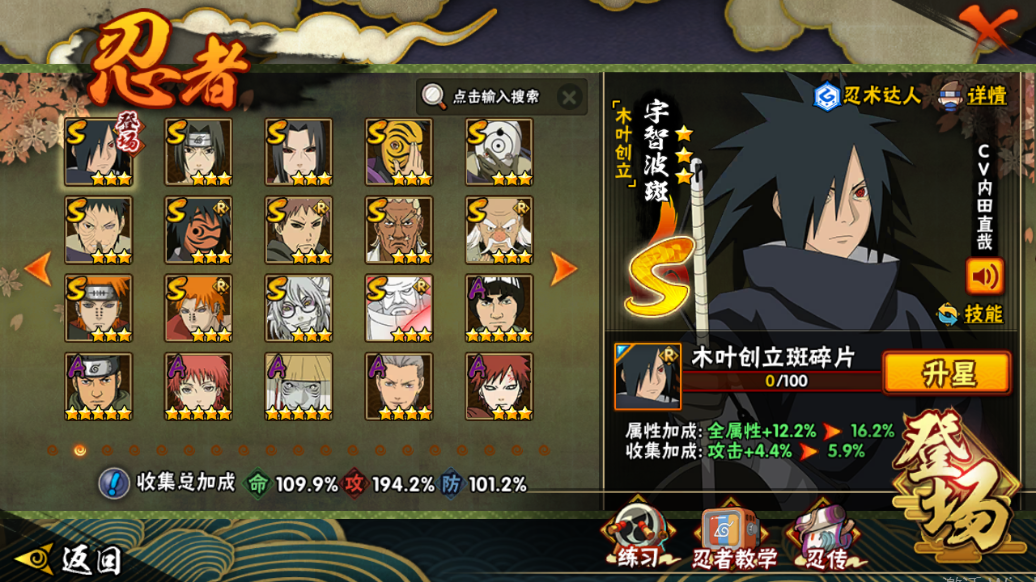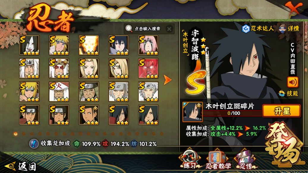 战力:1336W+;VIP11级;S忍34个;A忍38个,通灵兽18个,S忍:大蛇丸波风水门九喇嘛鸣人永恒万花筒佐助忍战樱普通纲手百豪纲手死门凯普通自来也豪杰自来也秽土水门猿飞日斩秽土猿飞千手扉间秽土扉间千手柱间木叶创立柱间秽土柱间宇智波斑