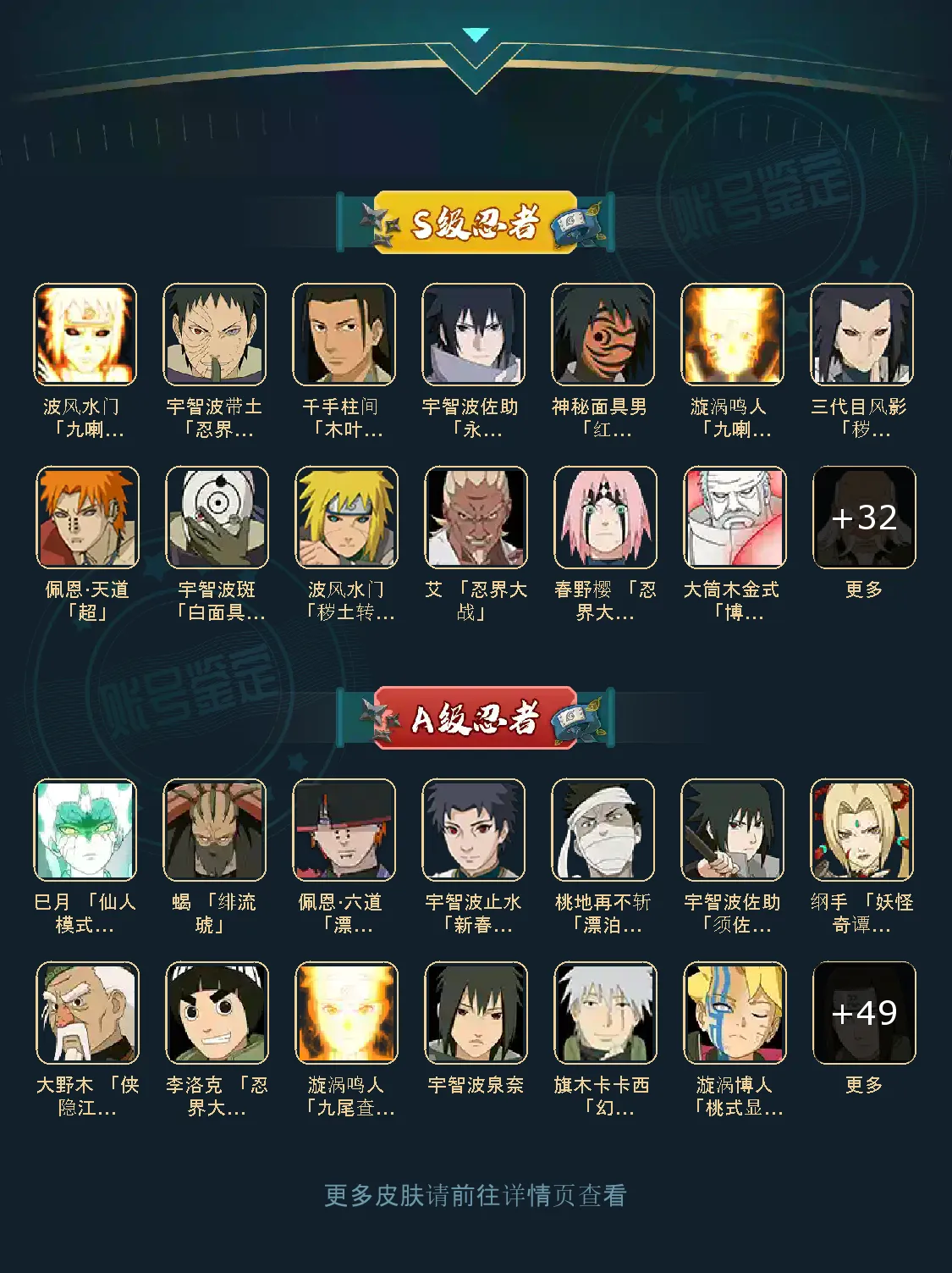 S忍42个;A忍51个,通灵兽26个,S忍:普通纲手猿飞日斩九喇嘛鸣人仙人自来也大蛇丸波风水门秽土柱间神秘面具男仙人兜永恒万花筒佐助忍战樱普通自来也豪杰自来也百豪纲手死门凯秽土水门秽土猿飞秽土扉间千手扉间千...