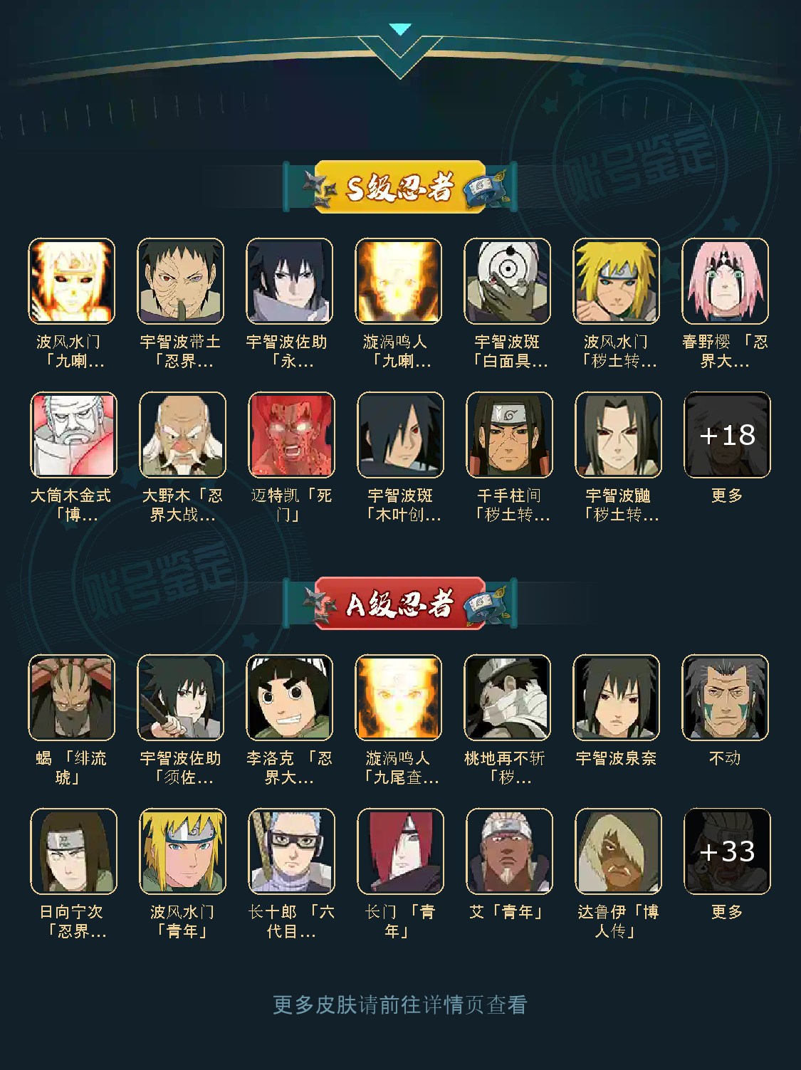 战力:1410W+;S忍31个;A忍40个,通灵兽22个,S忍:九喇嘛鸣人永恒万花筒佐助忍战樱普通自来也大蛇丸百豪纲手普通纲手死门凯波风水门秽土水门猿飞日斩秽土猿飞秽土扉间秽土柱间秽土斑木叶创立斑须佐鼬秽土鼬白面具忍战带土三代艾秽土半藏忍战