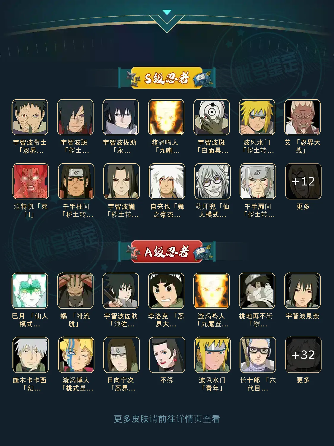 战力:1375W+;VIP5级;S忍22个;A忍36个,通灵兽17个,S忍:大蛇丸波风水门九喇嘛鸣人永恒万花筒佐助普通自来也百豪纲手普通纲手死门凯秽土水门豪杰自来也秽土猿飞秽土扉间千手扉间秽土柱间宇智波斑秽土解斑须佐鼬秽土鼬白面具忍战带土秽
