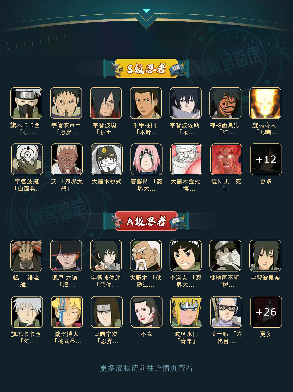 战力:1238W+;VIP11级;S忍22个;A忍33个,通灵兽21个,S忍:普通纲手九喇嘛鸣人永恒万花筒佐助忍战樱豪杰自来也大蛇丸死门凯波风水门秽土猿飞猿飞日斩秽土柱间木叶创立柱间木叶创立斑秽土解斑秽土鼬神秘面具男白面具忍战带土红夜面具男...展开全部