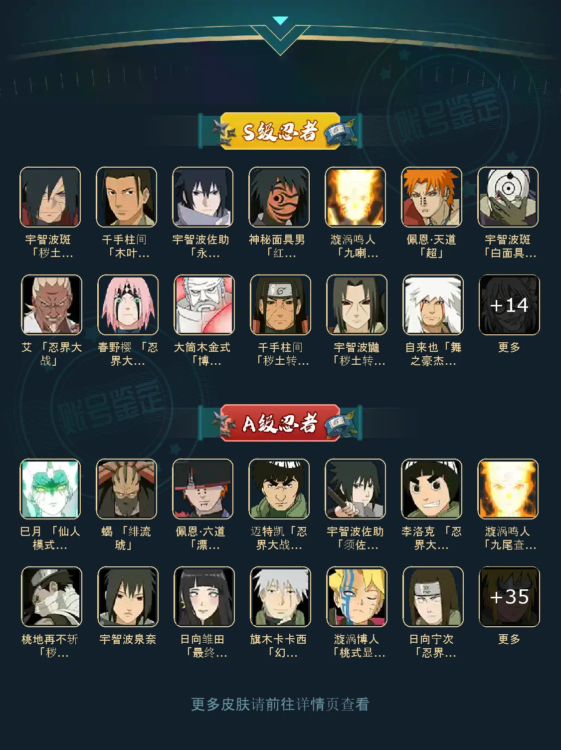 战力:1173W+;VIP13级;S忍22个;A忍37个,通灵兽20个,S忍:普通纲手九喇嘛鸣人永恒万花筒佐助忍战樱豪杰自来也大蛇丸波风水门猿飞日斩秽土扉间木叶创立柱间秽土柱间秽土斑秽土解斑秽土鼬白面具红夜面具男鬼灯幻月三代艾天道超秽土长门