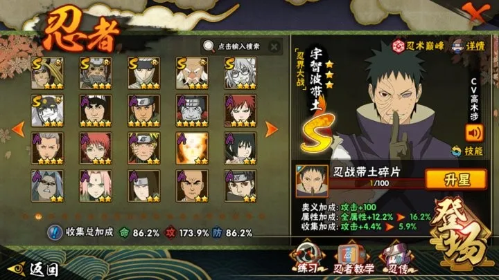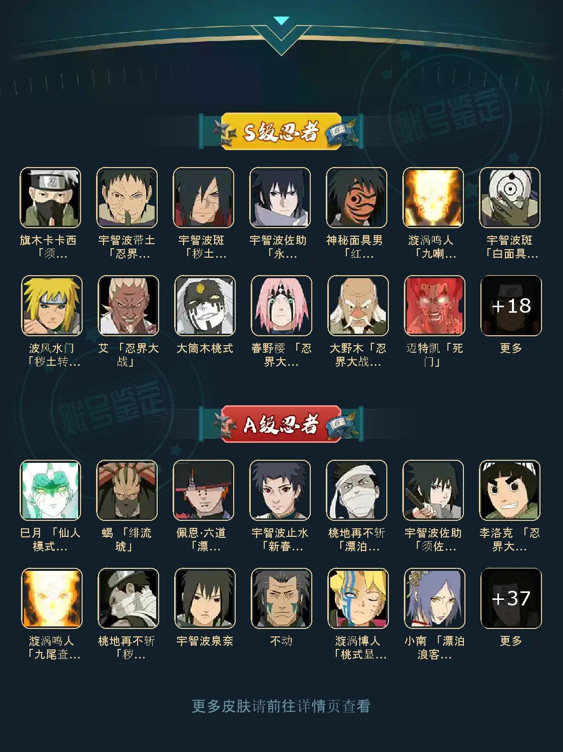 战力:1147W+;VIP11级;S忍26个;A忍38个,通灵兽19个,S忍:大蛇丸波风水门九喇嘛鸣人永恒万花筒佐助忍战樱普通纲手百豪纲手死门凯秽土水门豪杰自来也猿飞日斩秽土猿飞秽土扉间秽土柱间秽土斑秽土解斑秽土鼬白面具忍战带土红夜面具男金