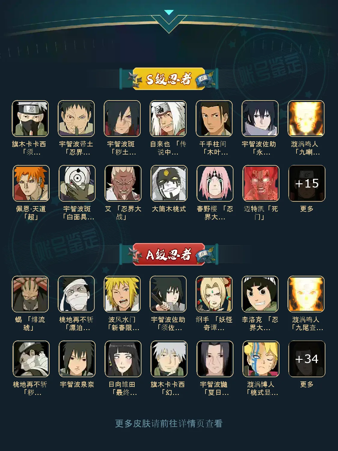 战力:1291W+;VIP11级;S忍23个;A忍38个,通灵兽20个,S忍:大蛇丸九喇嘛鸣人永恒万花筒佐助忍战樱普通自来也普通纲手死门凯波风水门猿飞日斩豪杰自来也秽土猿飞秽土柱间木叶创立柱间秽土斑秽土解斑须佐鼬秽土鼬白面具忍战带土三代艾天