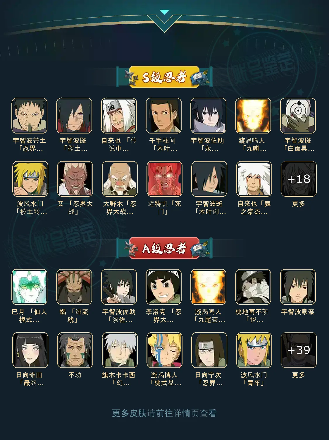 战力:1241W+;VIP13级;S忍27个;A忍43个,通灵兽18个,S忍:波风水门九喇嘛鸣人永恒万花筒佐助大蛇丸百豪纲手死门凯秽土水门秽土猿飞千手扉间秽土扉间木叶创立柱间秽土斑宇智波斑木叶创立斑秽土解斑须佐鼬神秘面具男白面具忍战带土四代
