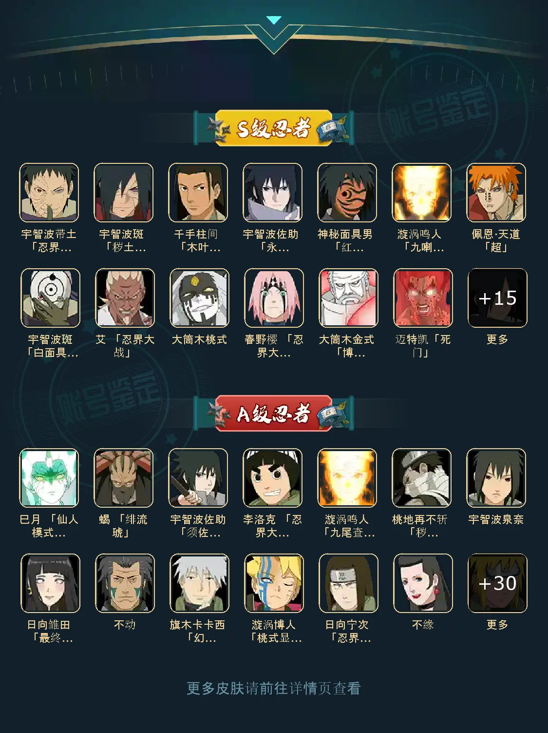 战力:1100W+;VIP11级;S忍25个;A忍33个,通灵兽19个,S忍:九喇嘛鸣人永恒万花筒佐助忍战樱豪杰自来也大蛇丸普通纲手死门凯波风水门猿飞日斩秽土柱间木叶创立柱间秽土斑木叶创立斑秽土解斑须佐鼬秽土鼬白面具忍战带土红夜面具男罗砂三