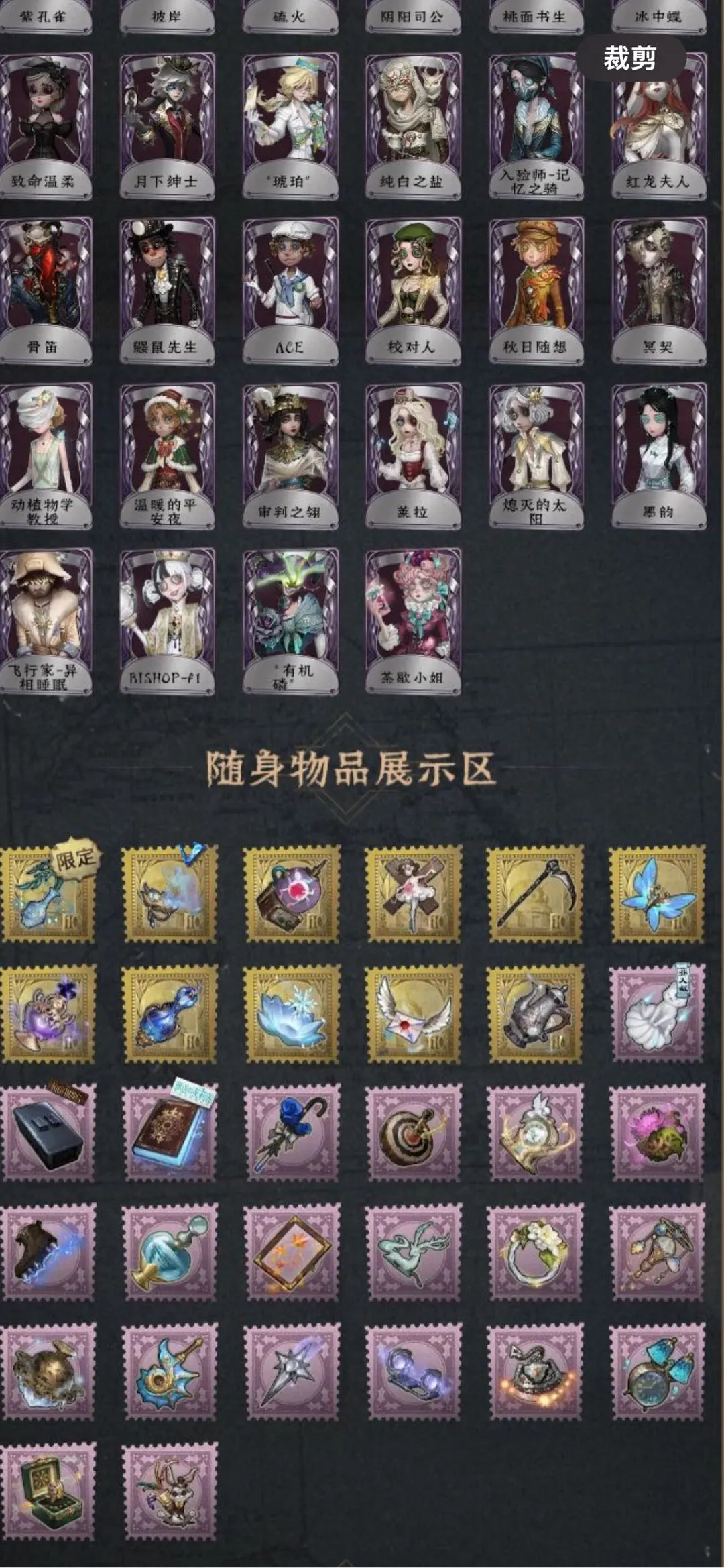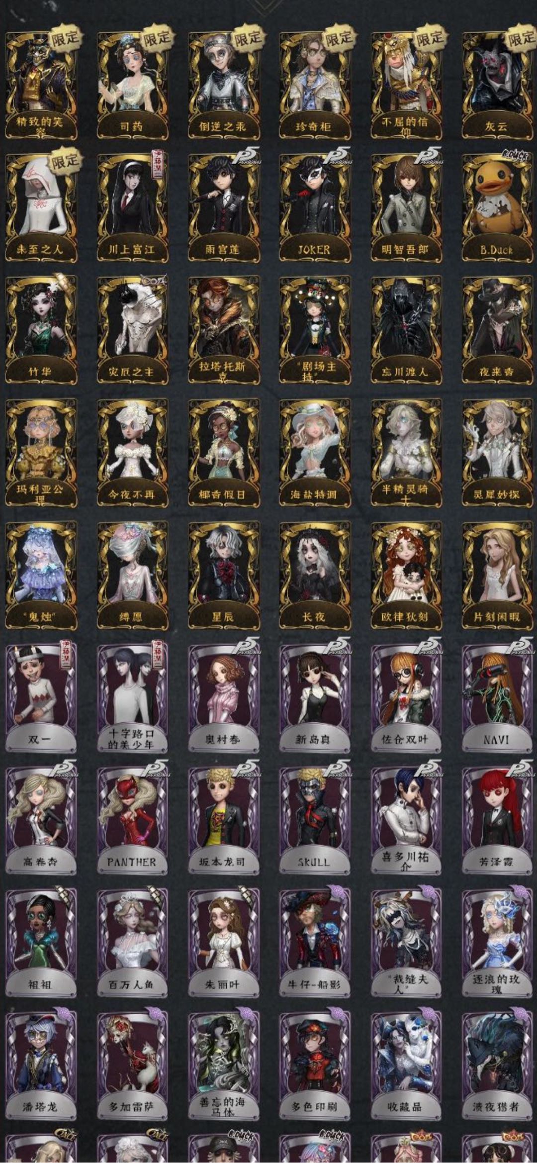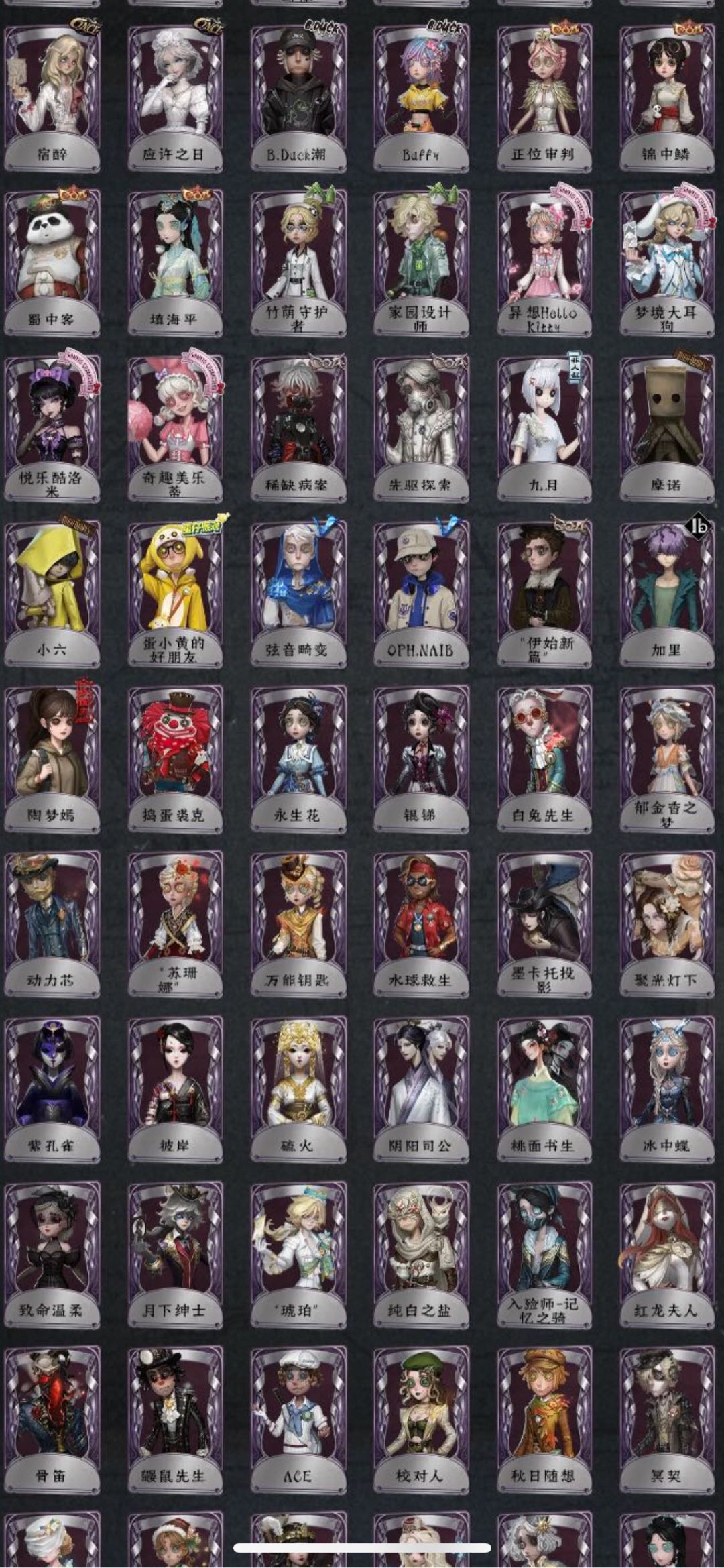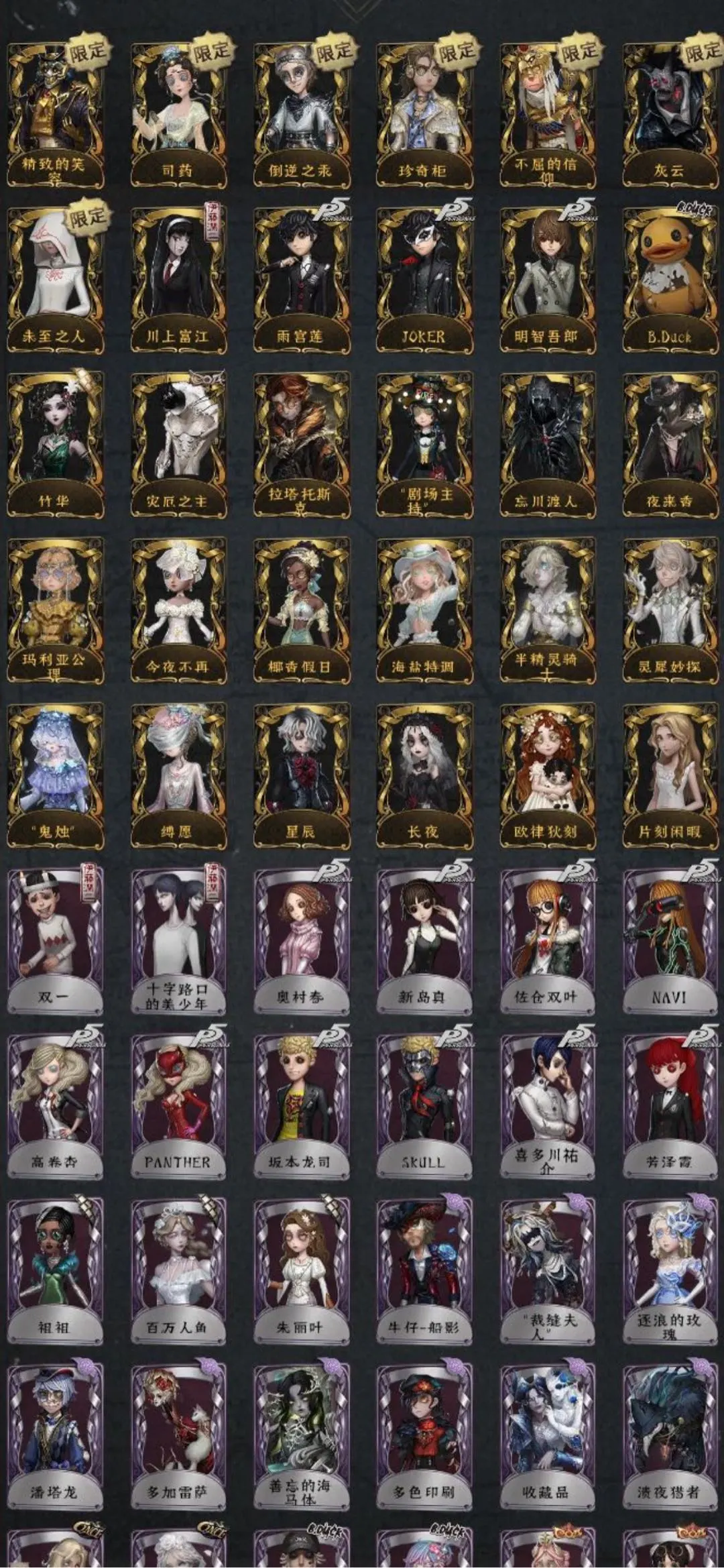 翦烛 筠心 缚愿 精致的笑容 鬼烛 司药套折柳 倒逆之汞 珍奇柜 不屈的信仰 灰云 未至之人 今夜不再 川上富江 雨宫莲 JOKER 明智吾郎 B.Duck竹华 灾厄之主 剧场主持 忘川渡人 夜来香 玛利亚公理 椰香假日 海盐特调 半精灵骑士 灵犀妙探 星辰 长夜 欧律狄刻 片刻闲暇 双一 十字路口的美少年 奥村春 新岛真 佐仓双叶 NAVI 高卷杏 PANTHER 坂本龙司 SKULL 喜多川祐介 祖祖 百万人鱼 朱丽叶 牛仔-船影 逐浪的玫瑰 多加雷萨 收藏品 宿醉 应许之日 B.Duck潮 Buffu 正位审判 锦中鳞 蜀中客 古董商-填海平 竹荫守护者 家园设计师 异想Hello Kitty 梦境大耳狗 悦乐酷洛米 奇趣美乐蒂 稀缺病案 先驱探索 九月 摩诺 小六 蛋小黄的好朋友 弦音畸变 OPH.NAIR 捣蛋裘克 永生花 白兔先生 动力芯 苏珊娜 万能钥匙 水球救生 墨卡托投影 紫孔雀 彼岸 硫火 阴阳司公 桃面书生 冰中蝶 琥珀” 茶歇小姐 纯白之盐 入验师-记忆之骑 鼹鼠先生 ACE 秋日随想 动植物学教授 温暖的平安夜 飞行家-异相睡眠 莱拉 墨韵 BISHOP-f1 “有机磷”