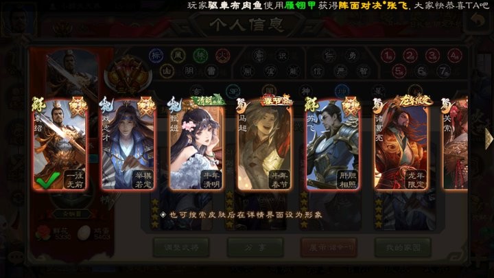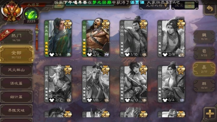 神张辽,神陆逊,神吕蒙,神周瑜 谋夏侯渊,谋徐晃,界钟会,界曹植,曹昂,戏志才 甘夫人,谋孟获,谋赵云,谋张飞,谋马超,谋黄忠,谯周,花鬘,诸葛瞻,鲍三娘 谋吕蒙,界朱然,步骘 友庞统,谋高顺,裴秀,马日磾,谋刘赪,谋华雄,星黄忠,南华老仙,荀谌,界李儒,界刘表,丁原,董承,界公孙瓒,苏飞,星张辽,界高顺,刘焉 大将军 举棋若定·戏志才,龙袭星落·王朗,潜蛟觊天·钟会,蛇年限定·孙寒华,灵魂歌王·留赞,抗音而歌·留赞,雄踞益州·刘焉