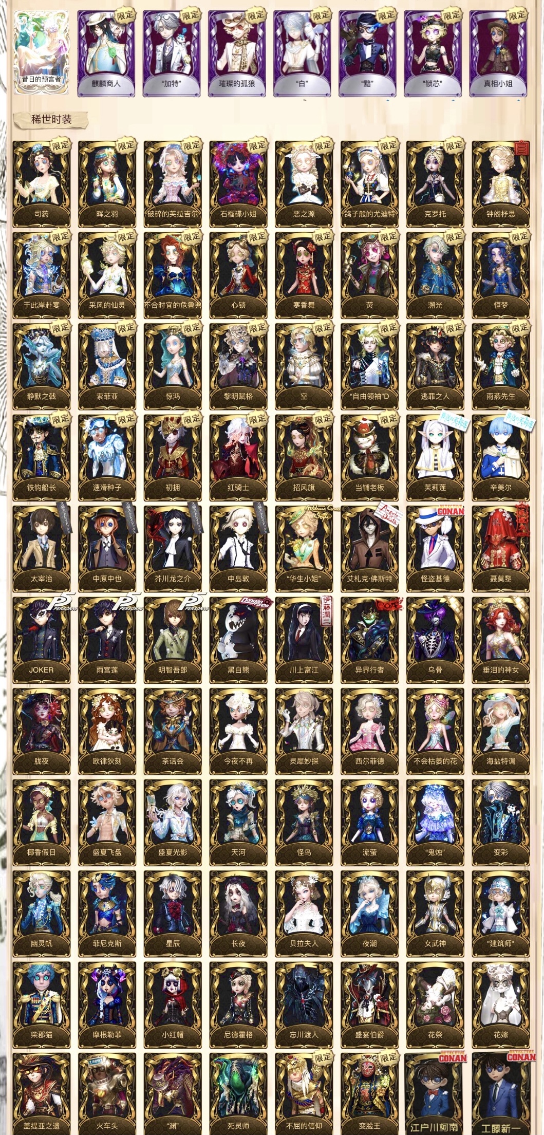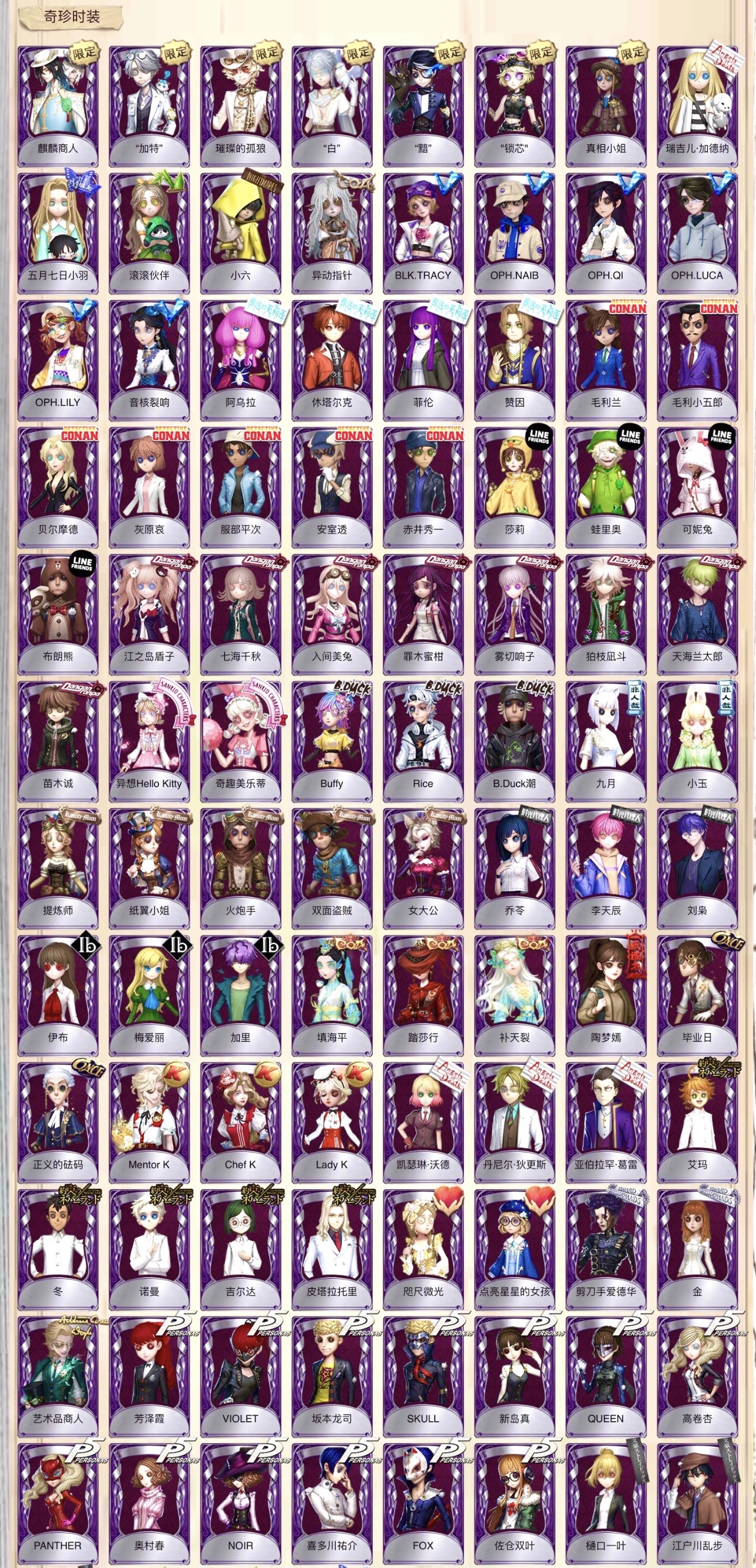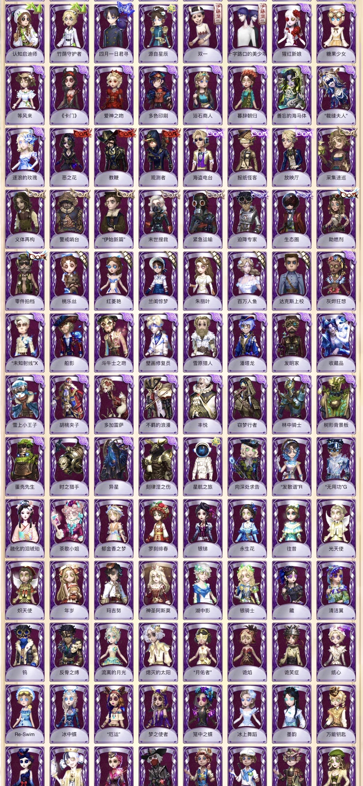 ❤️新增红蝶-胧夜 幻灯师-于此岸赴宴 勘探员-璀璨的孤狼 囚徒二限-黎明赋格 机械师电竞套(有金挂)台球手金皮-自由领袖 气象学者-芙莉莲(有配套金挂) 骑士-辛美尔(有配套金挂) 祭司-阿乌拉 心理学家-菲伦 病患-休塔尔克 玩具商熊猫皮-认知启迪师 机械师-锁芯 调香师-聂莫黎 调酒二限-破碎的芙拉吉尔 小女孩-石榴碟小姐 气象学家-茶歇小姐 拉拉队员-oph电竞套律 师溯洄-正义的砝码 心理学家金皮-恒梦 病患金皮-溯光 弓箭手金皮-不合时宜的危鲁弗 昆虫学者冠军紫皮-踏莎行
