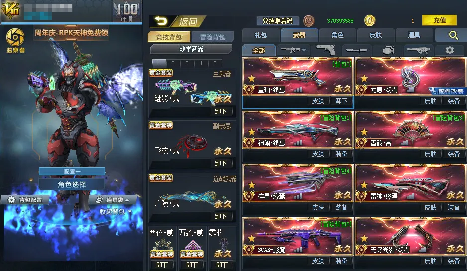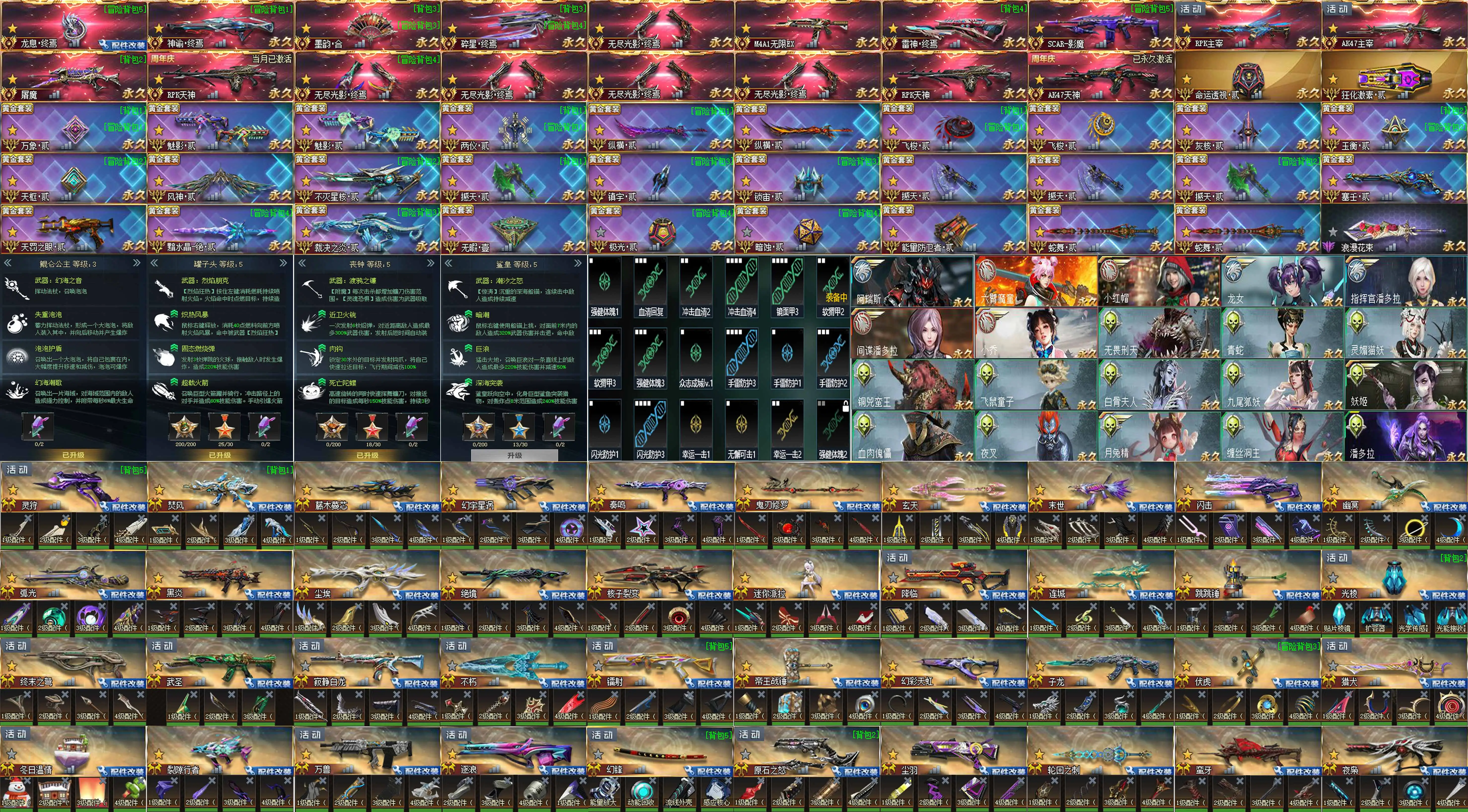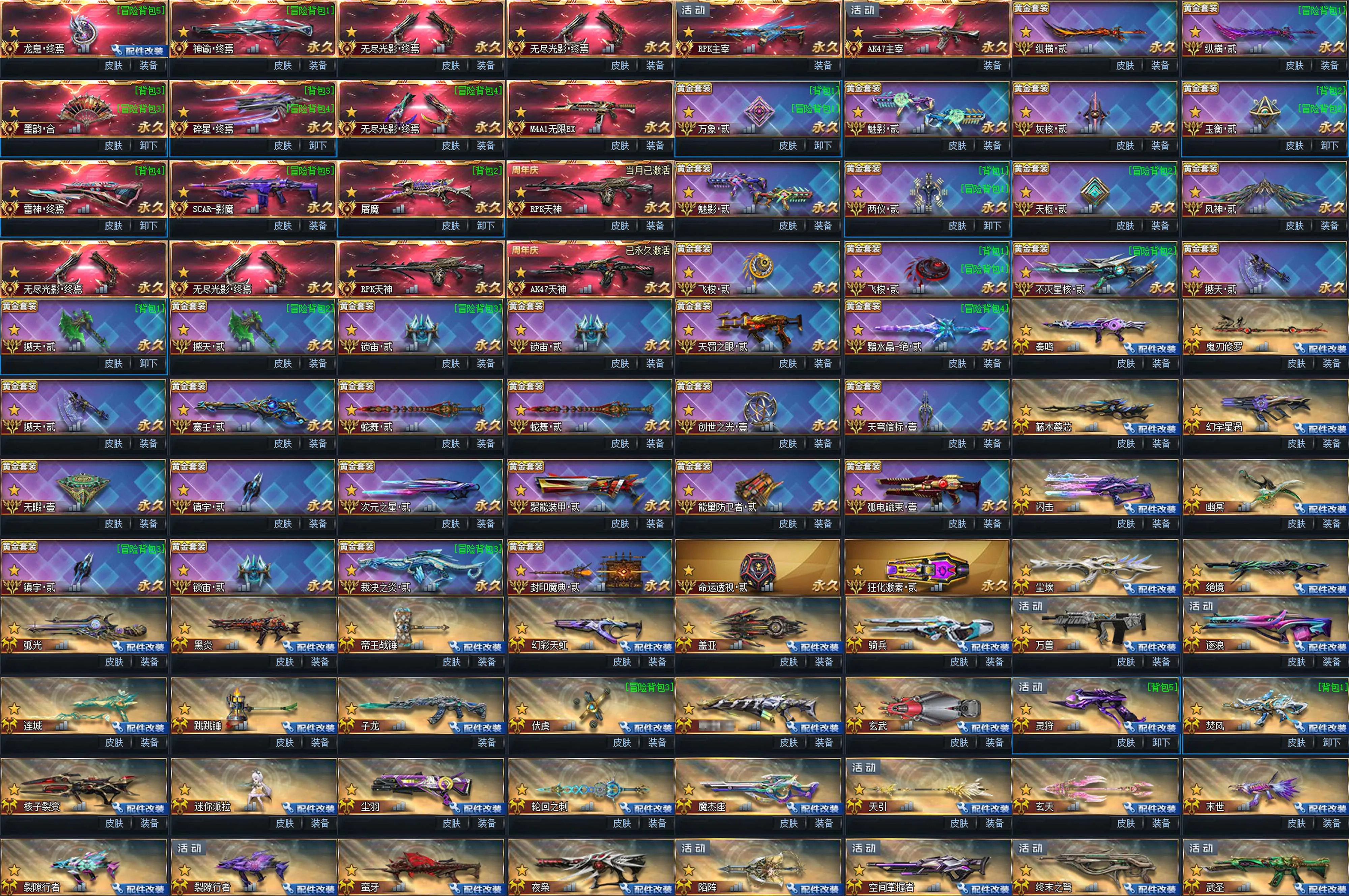 传说武器:星珀终焉◆RPK主宰◆龙息·终焉◆神谕·终焉◆AK47主宰◆墨韵·合◆碎星·终焉◆雷神·终焉◆SCAR-影魔◆无尽光影·终焉◆M4A1无限EX◆屠魔◆AK47天神◆