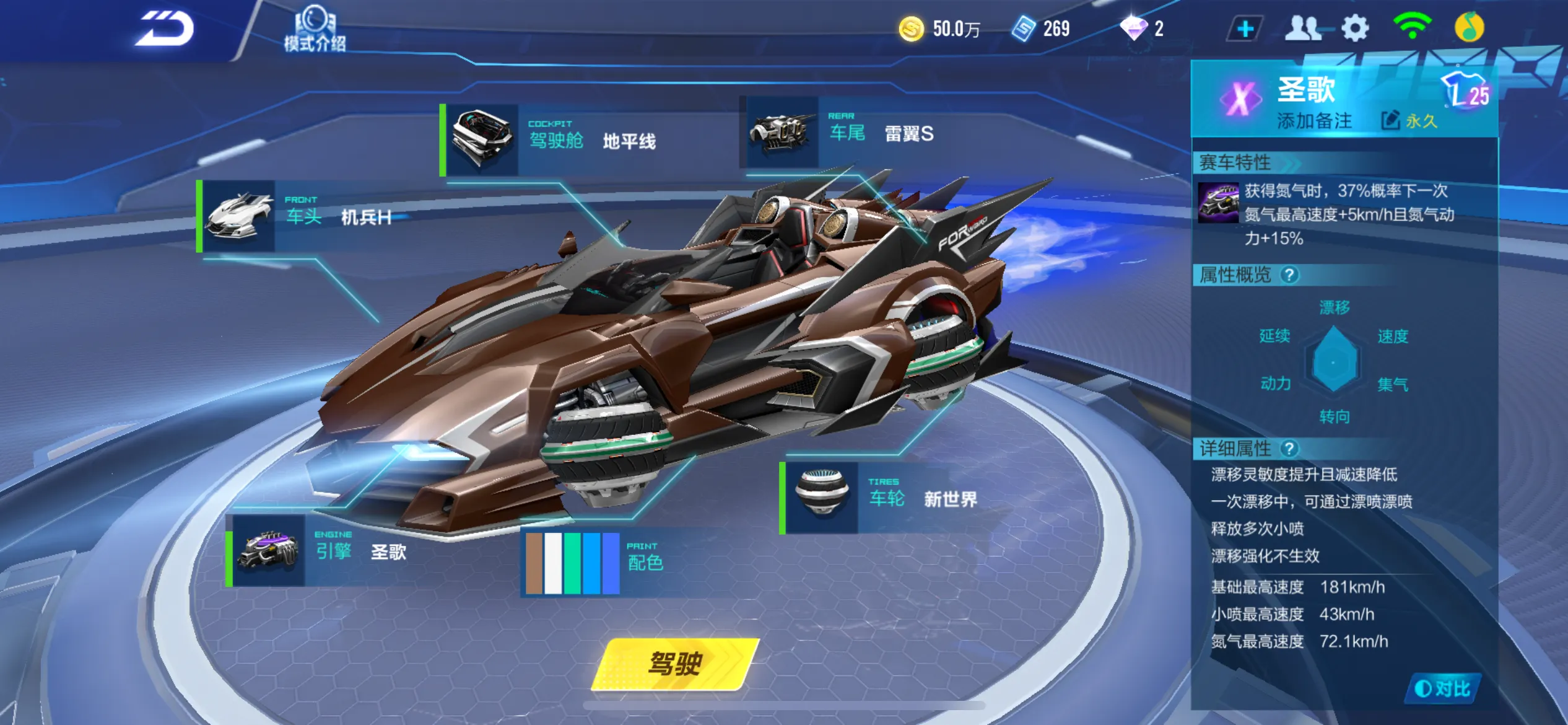 悬浮车圣歌X圣歌悬浮车、车头:机头兵H、驾驶舱:地平线、车尾:雷翼S、车轮:新世界、引擎:圣歌