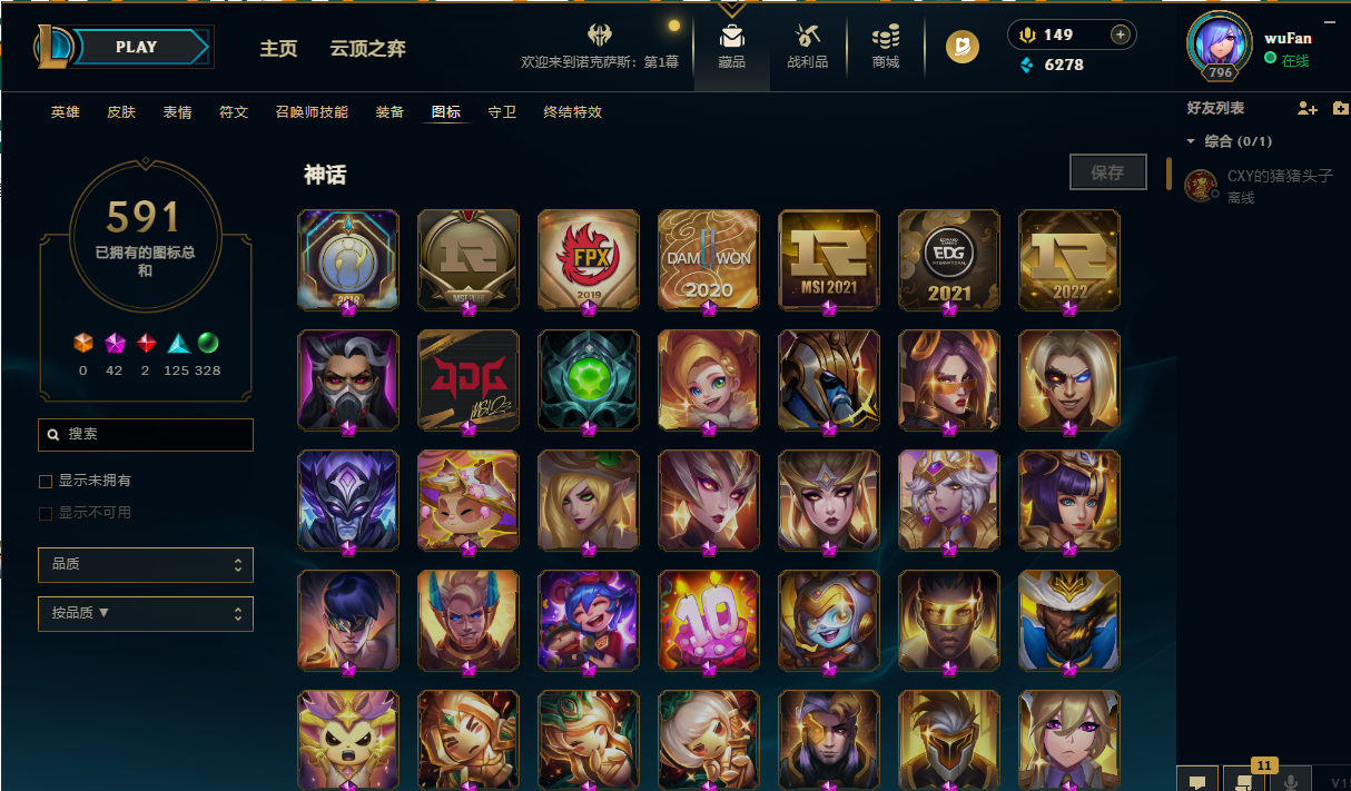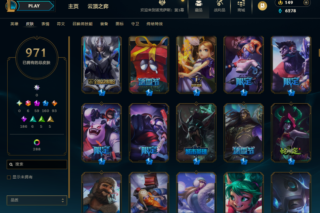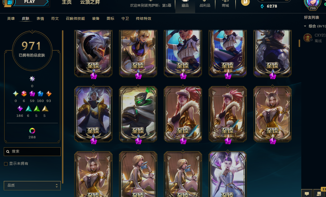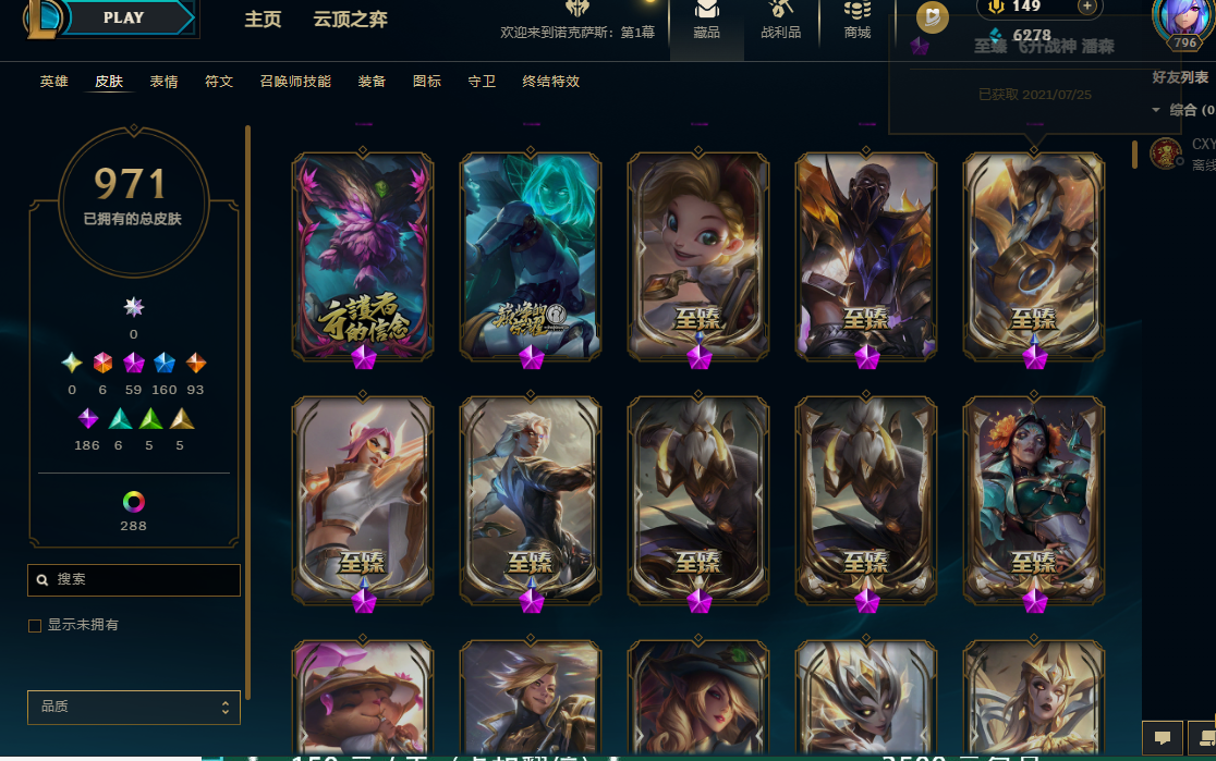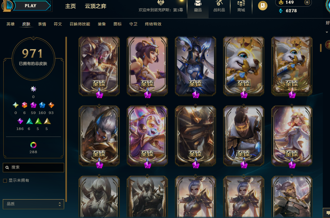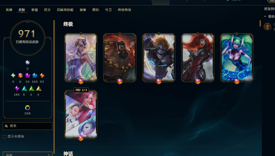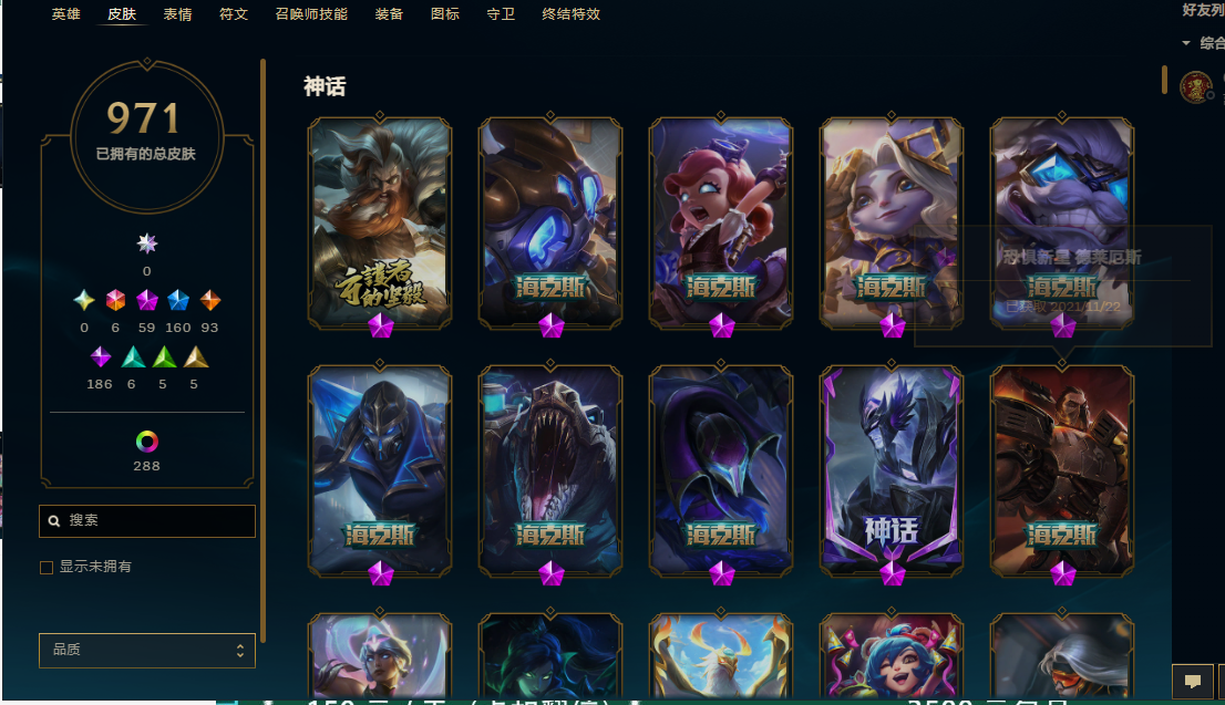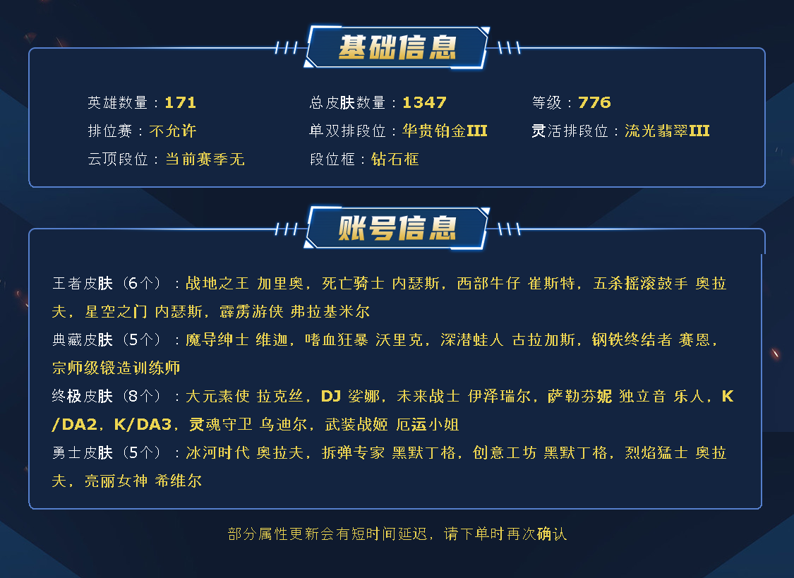 169英雄/1300皮/8终极/59神话/kda芬妮全套/DJ琴女/武装厄运/暗杀星套/冠军套/skt套