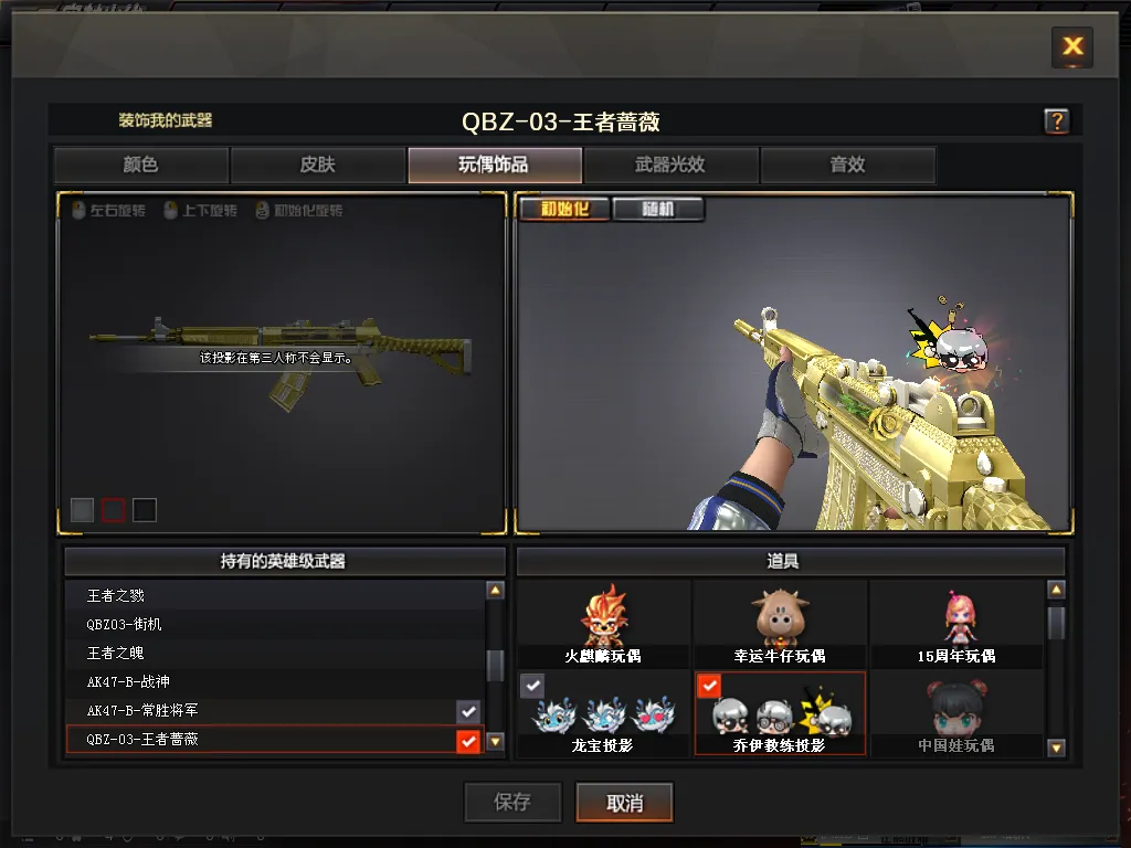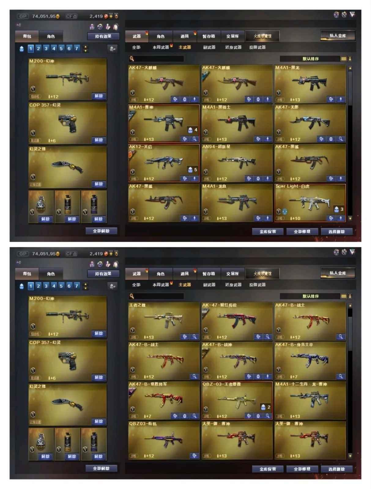 王者武器:王者之魄-觉醒版;QBZ-03-王者蔷薇-觉醒版;炫金千变;王者之锋-觉醒版;炫金无影;炫金修罗;王者之戮;王者之怒;炫金毁灭;M4A1-十二生肖·龙-雷神