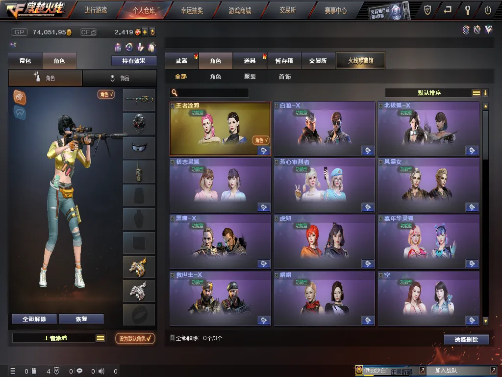 角色:风暴女;影武者-X;救世主-X;王者涂鸦;圣诞潘多拉-X;空;灵狐者;幻影;复仇者;潘多拉;飞虎队;猎狐者;堕天使;活力灵狐;兰;G.E.M.邓紫棋;夜玫瑰;威锋;陈龙野-X;陈龙野-Y;救世主;雷豹;斯沃特精英;猎狐者-X;铁骑