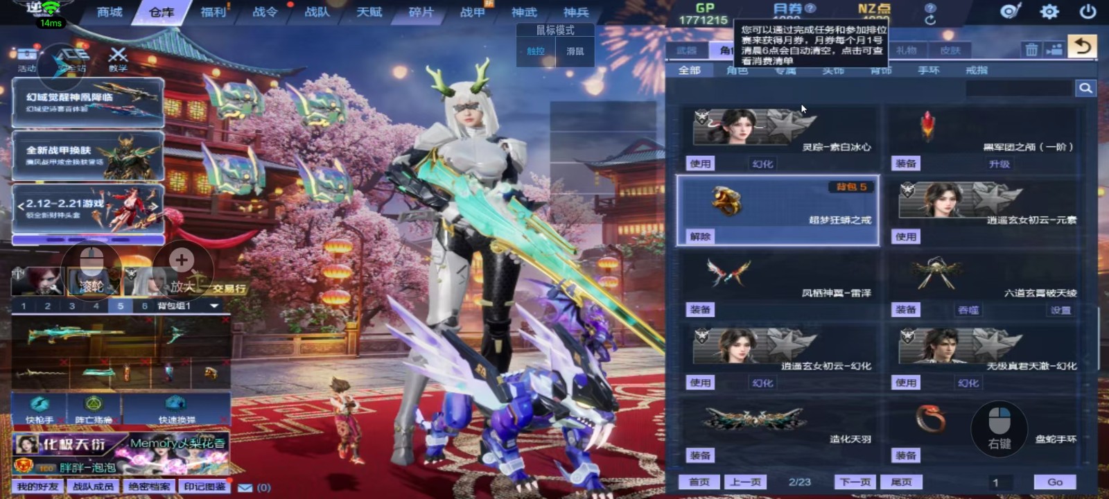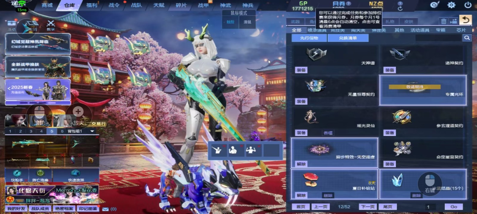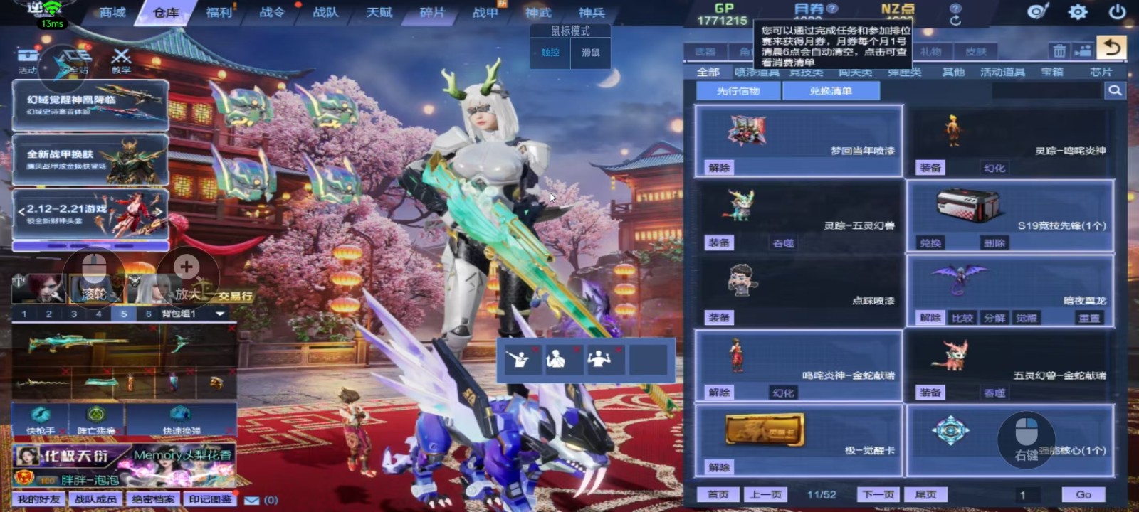 神域套10+10,天耀套带核心全装、山海9+9、天帝神凰套六核、幻域套、天启七神武(波塞冬皮肤)、创世套、488武器、4688戒指、红衣、赤龙头盔、六道玄霄破天、新翅膀、新幻化角色、各种僚机和无人机,精绝女王觉醒,锋影强能臂铠,双子,白浪头盔,