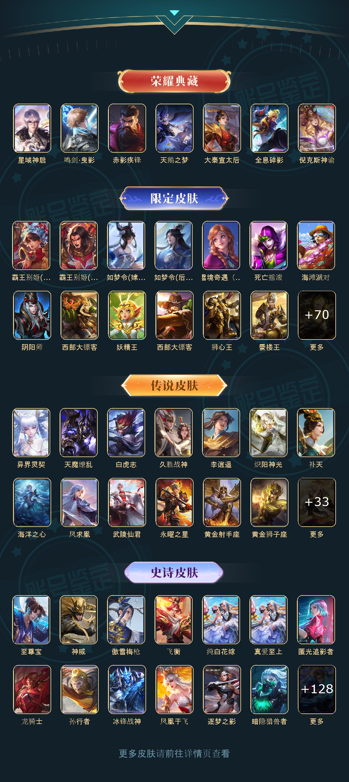 冰锋战神/街头霸王/天鹅之梦/纯白花嫁/天魔缭乱/至尊宝/真爱至上/王者之锤/大秦宣太后/凤求凰/逐梦之影/武陵仙君/神奇女侠/黄金狮子座/全息碎影/冰霜恋舞曲/青龙志/白虎志/朱雀志/太华/久胜战神/飞衡/梁祝/倪克斯神谕/白鹤梁神女/匿光追影者/鸣剑·曳影/遇见胡旋/龙胆/星域神启/李逍遥/武圣/奔雷神使/孙行者/补天/异界灵契/神威/傲雪梅枪/淬星耀世/时雨天司