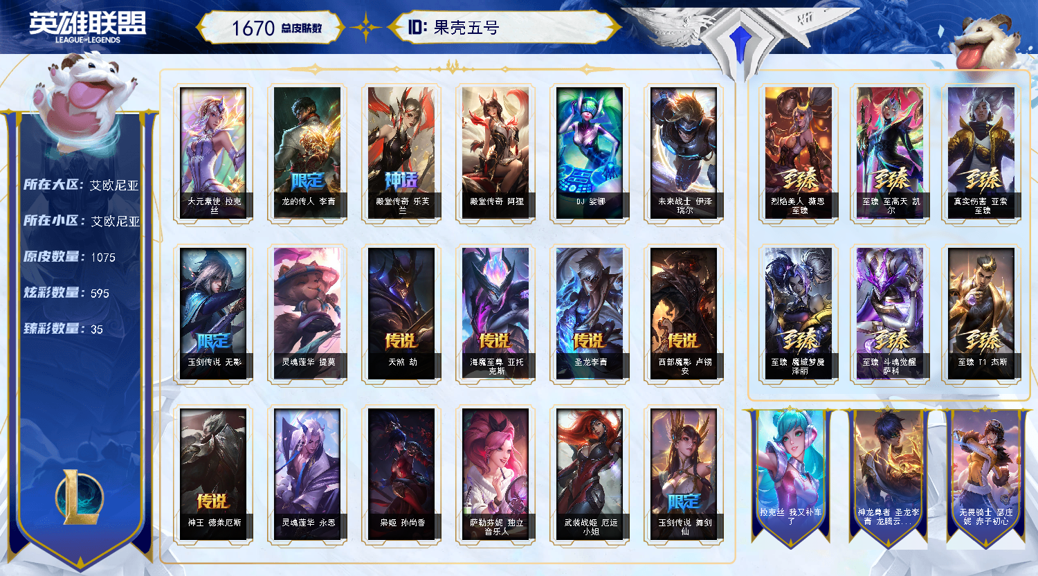 果壳丨可排位丨艾欧尼亚丨1420皮丨海魔至尊丨殿堂传奇阿狸丨商城清空丨玉剑男女刀丨抵抗军丨心之钢